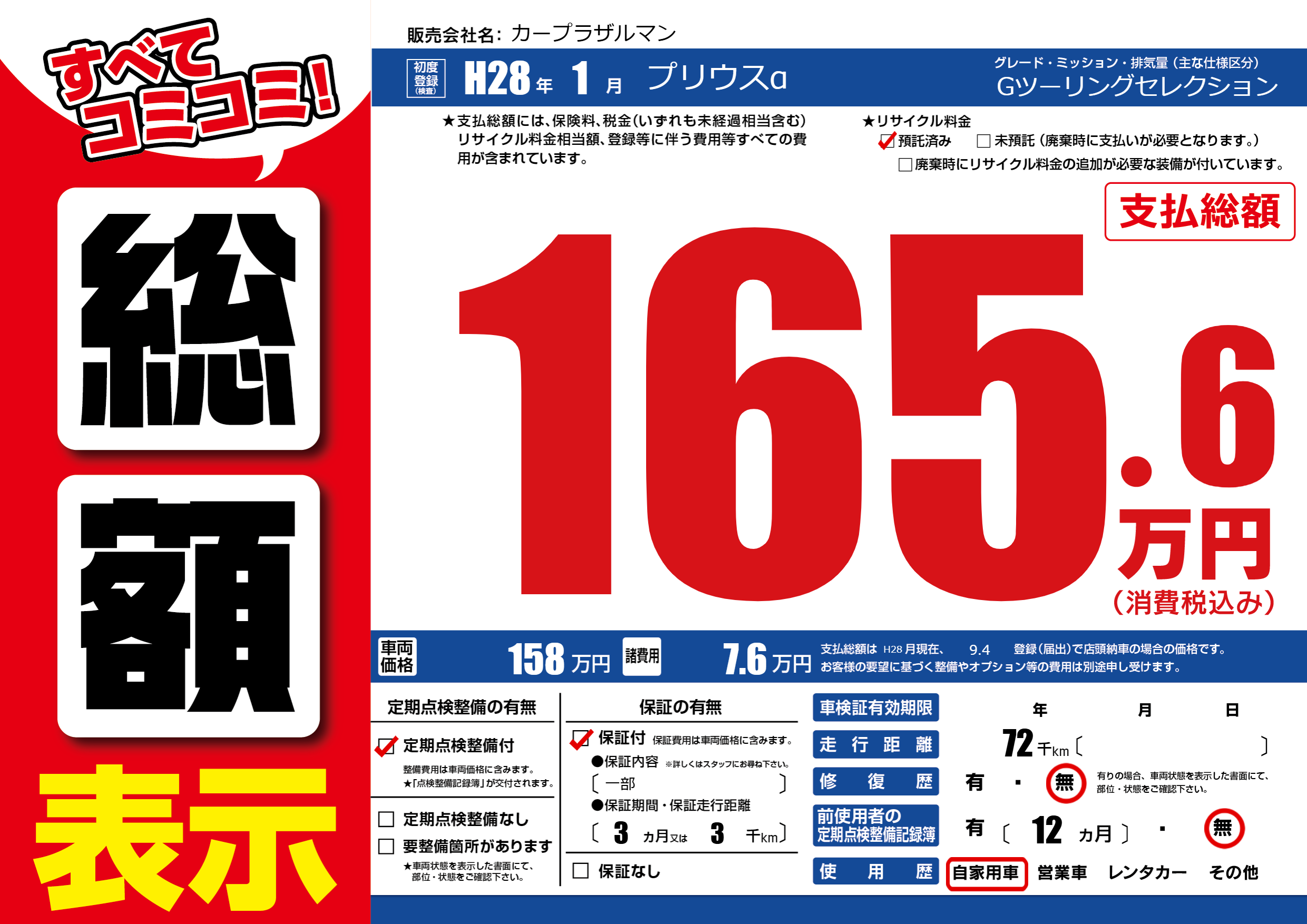 | 車名 | プリウスα | グレード ミッション 排気量 |