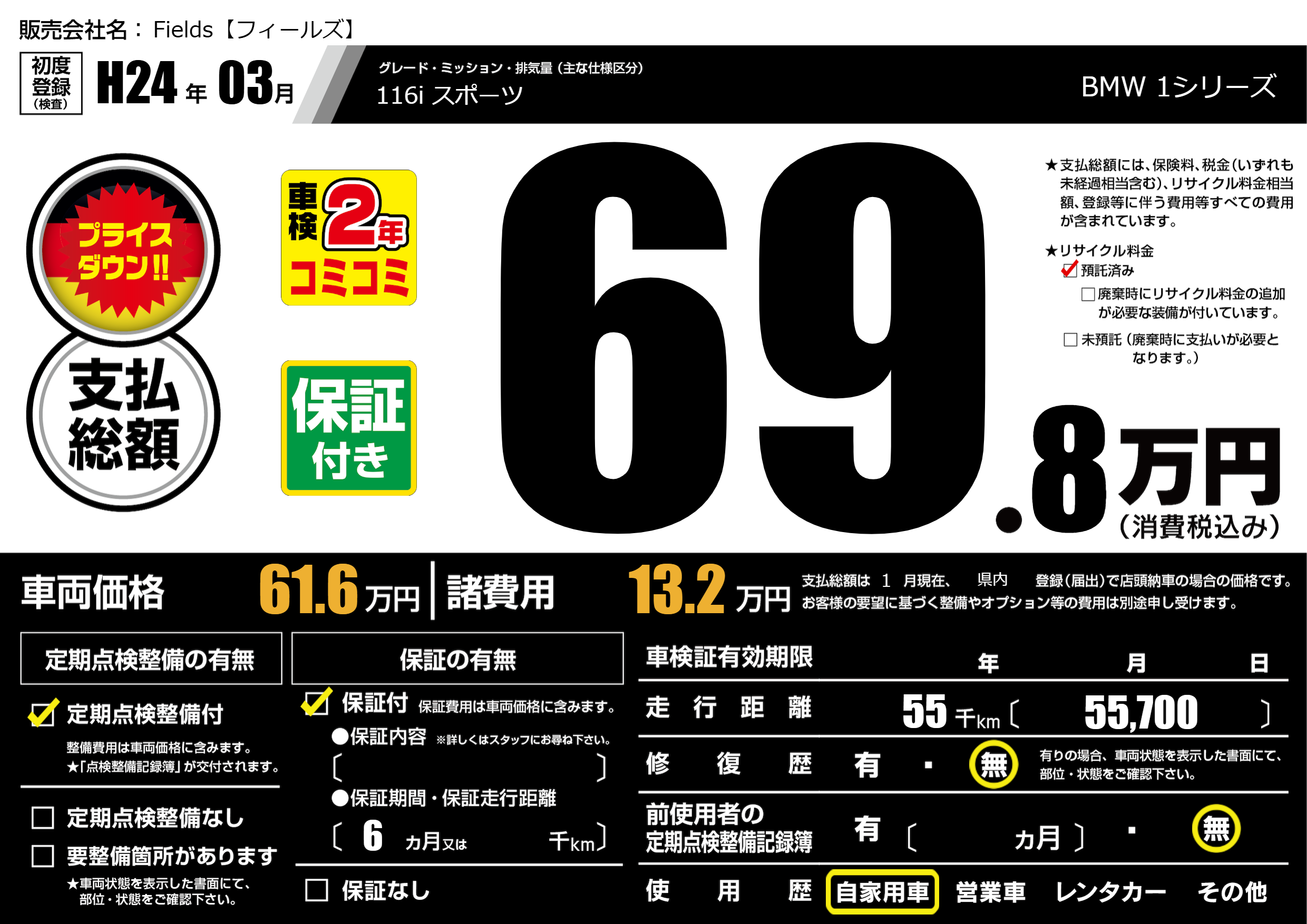 | 走行キロ | 5.5万km | 初年度登録 | H24年03月 |