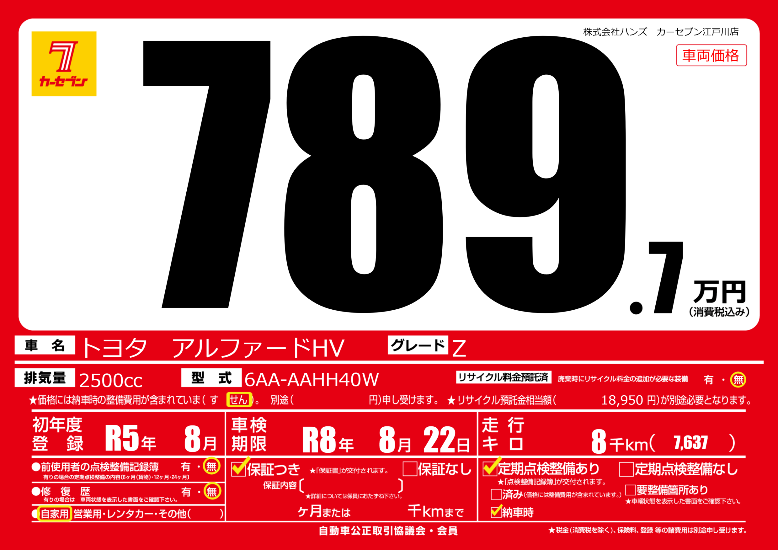 | 車名 | トヨタ アルファードHV | グレード ミッション 排気量 |