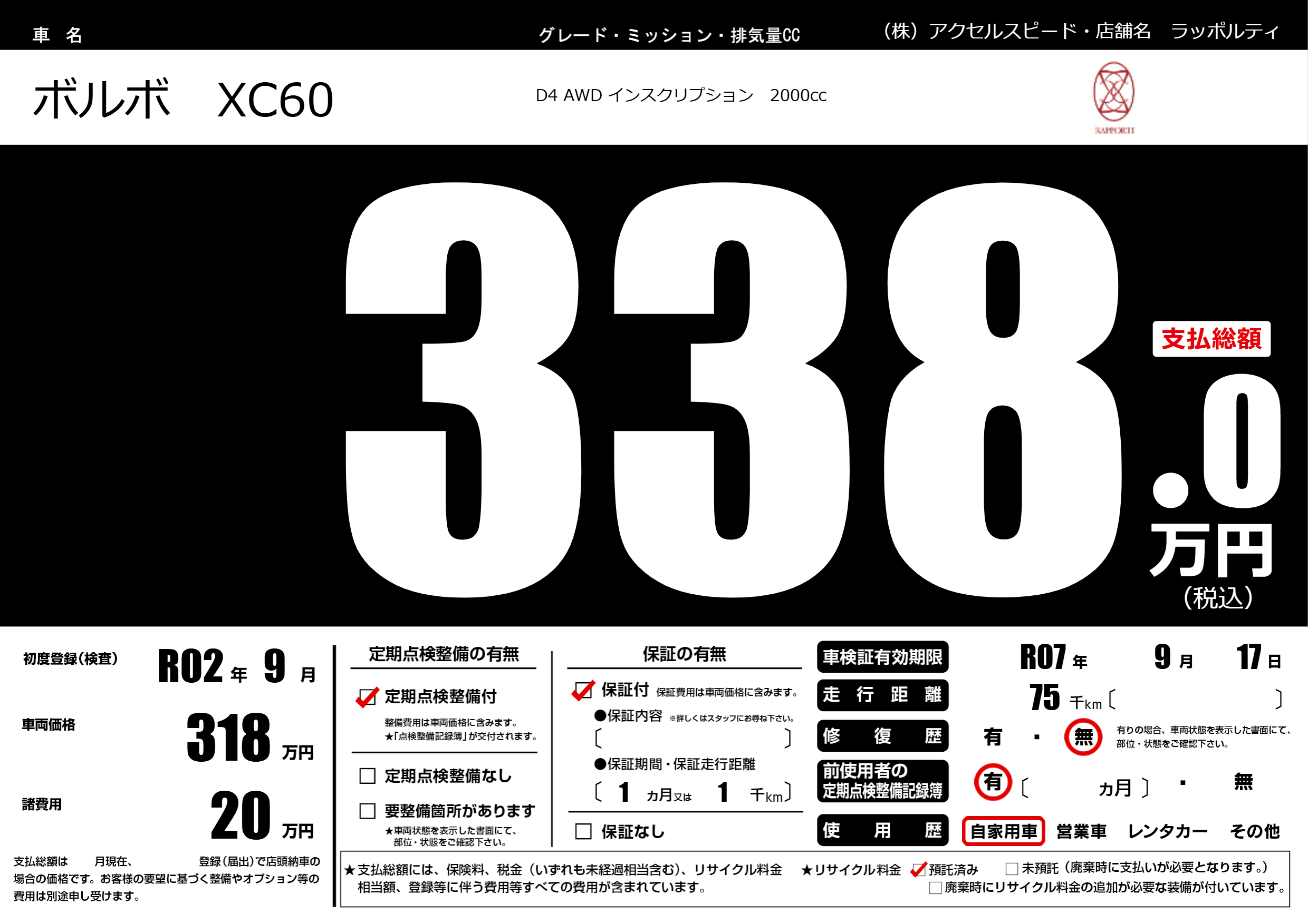 | 車名 | ボルボ XC60 | グレード ミッション 排気量 |