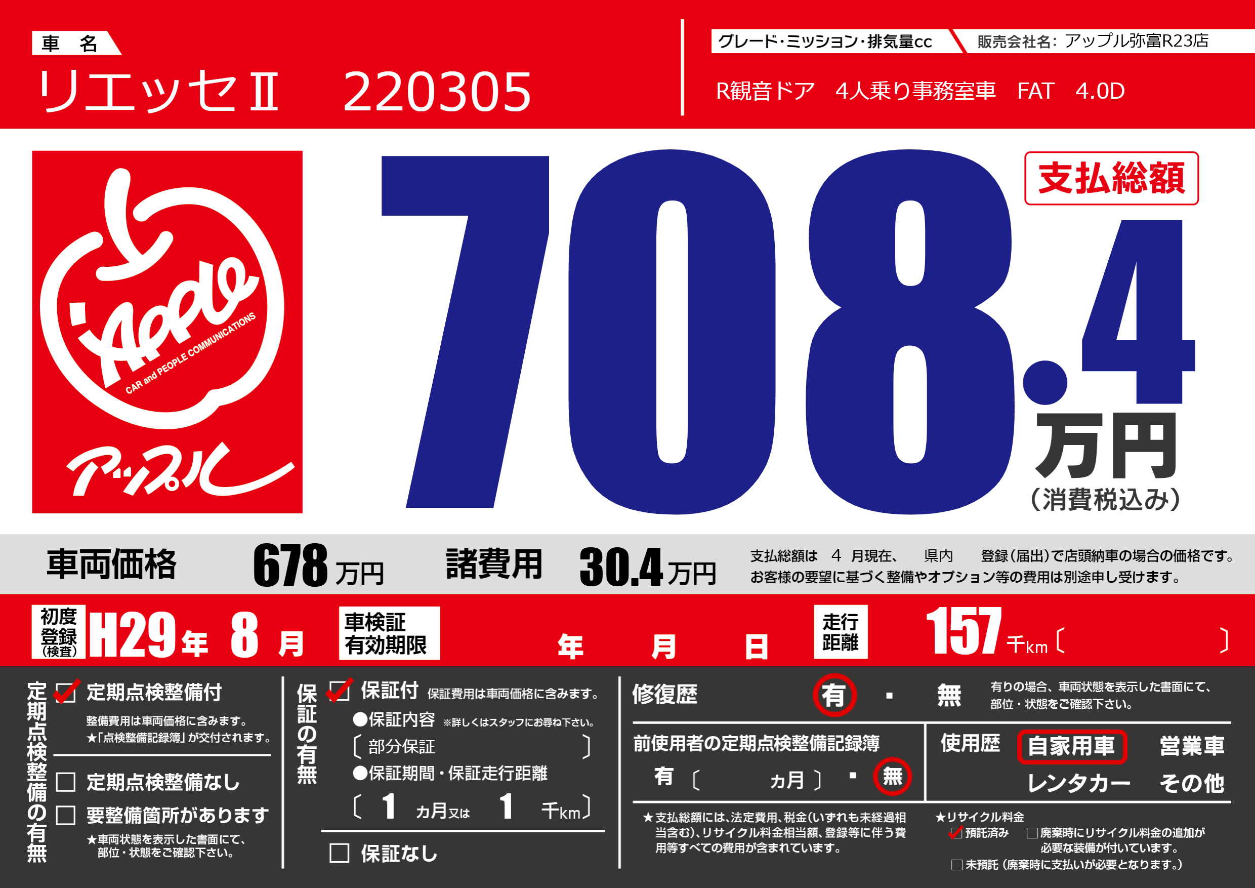 | 車名 | リエッセⅡ 220305 | グレード ミッション 排気量 |