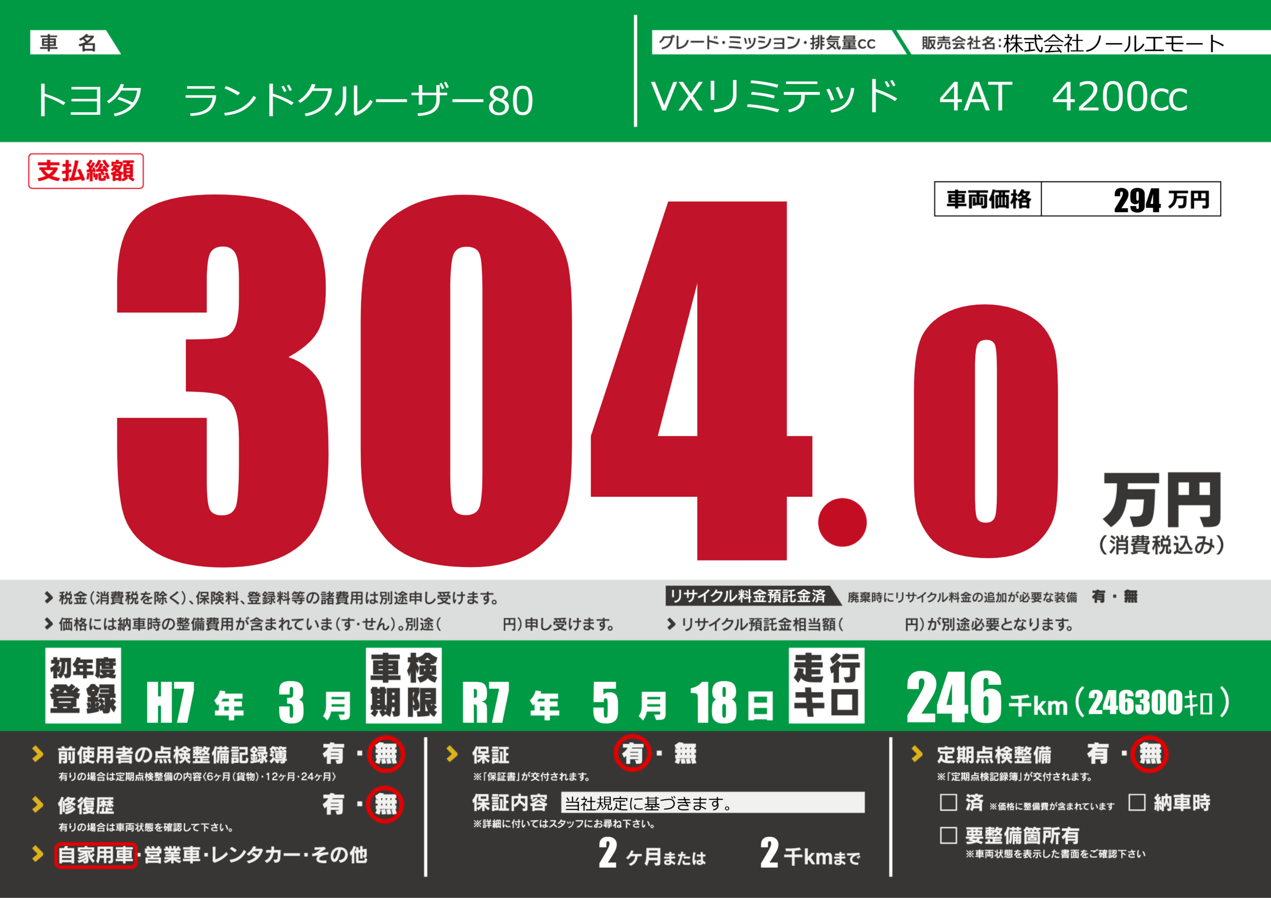 | 車名 | トヨタ ランドクルーザー80 | グレード ミッション 排気量 |
