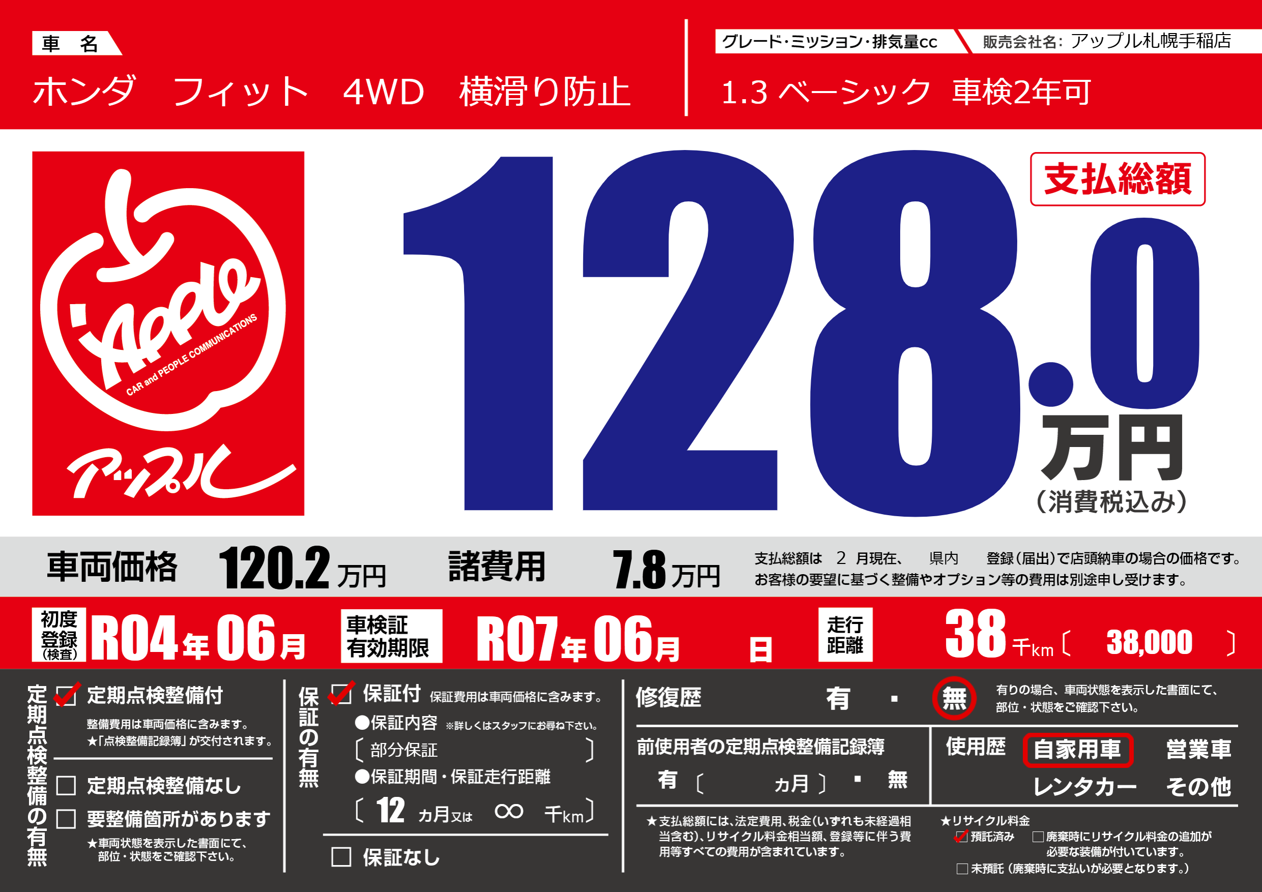| 走行キロ | 3.8万km | 初年度登録 | R04年06月 |