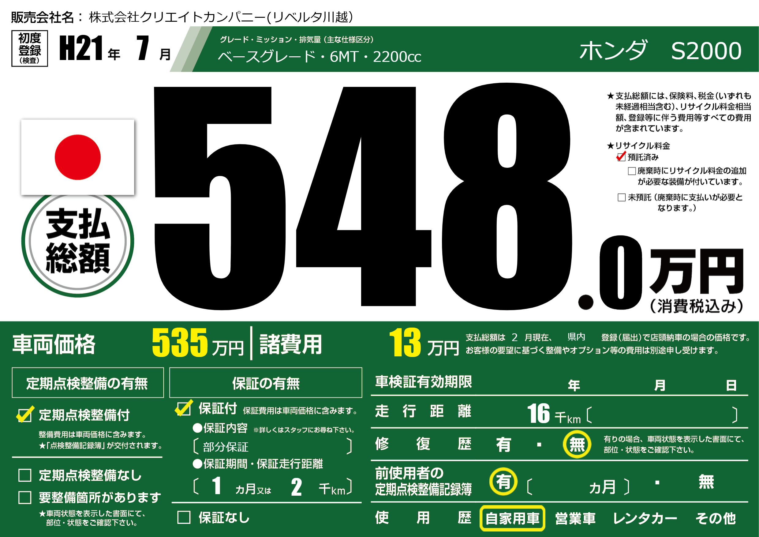 | 車名 | ホンダ S2000 | グレード ミッション 排気量 |