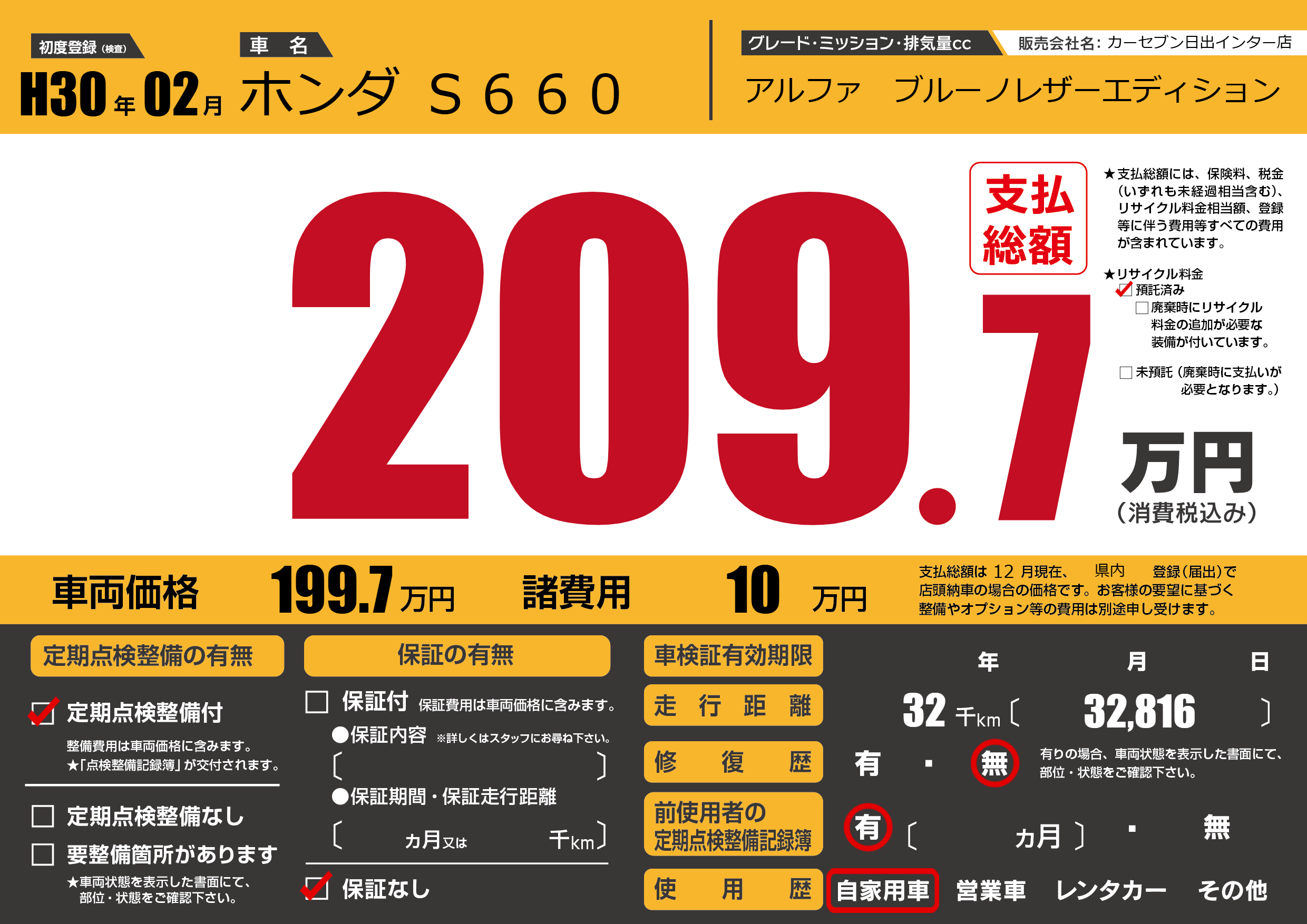 | 車名 | ホンダ S660 | グレード ミッション 排気量 |