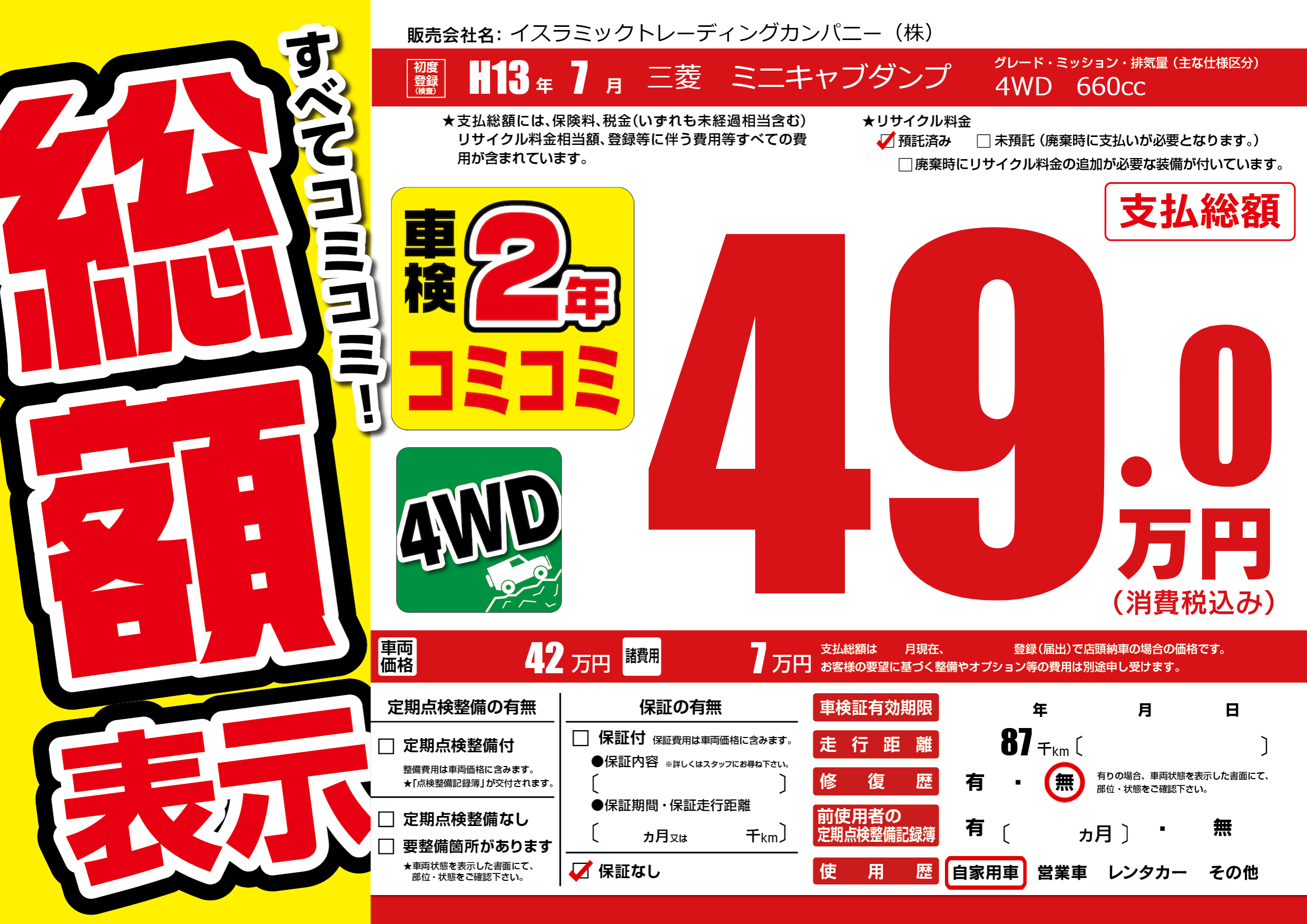 | 走行キロ | 8.7万km | 初年度登録 | H13年7月 |
