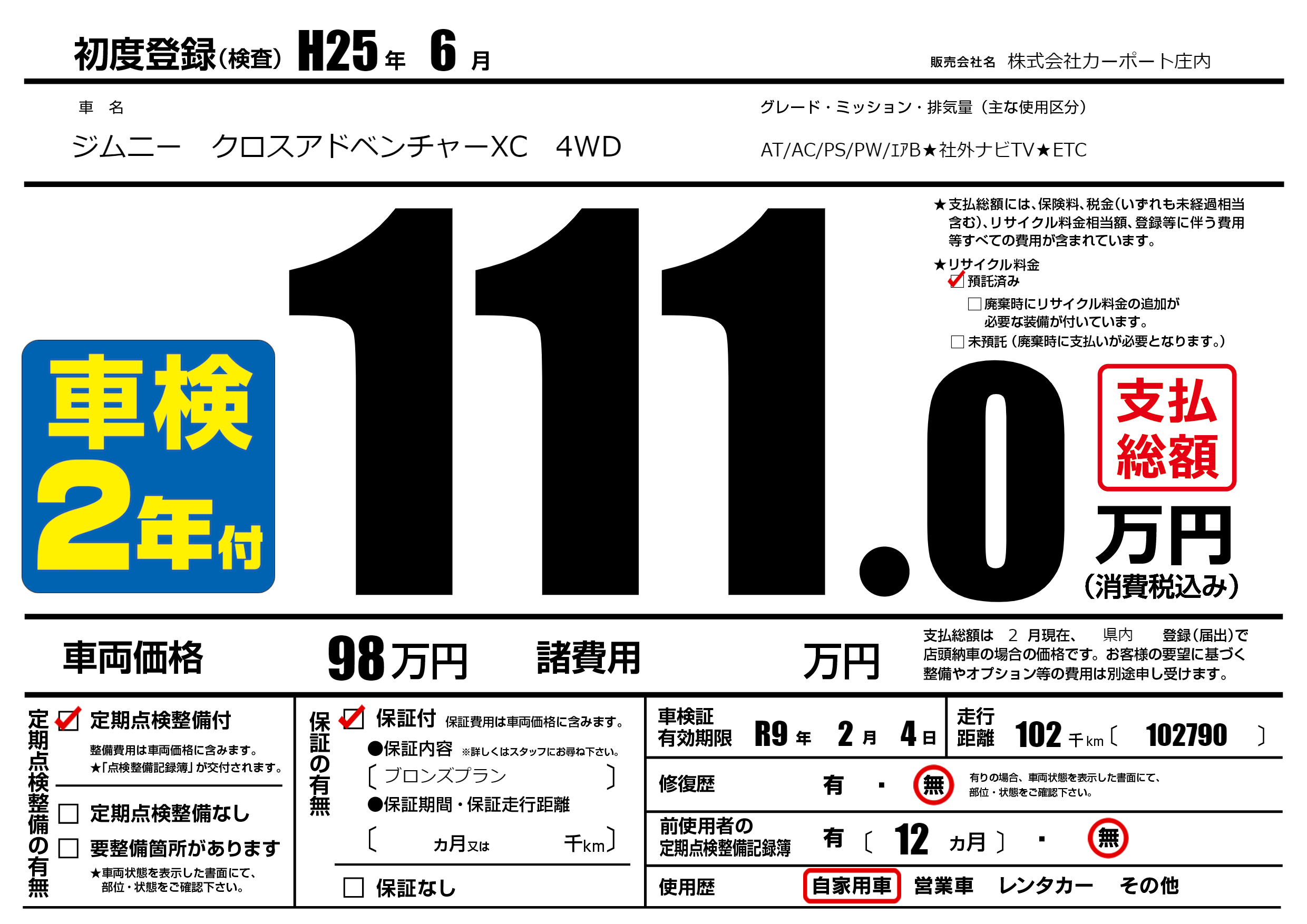 | 車名 | ジムニー クロスアドベンチャーXC 4WD | グレード ミッション 排気量 |