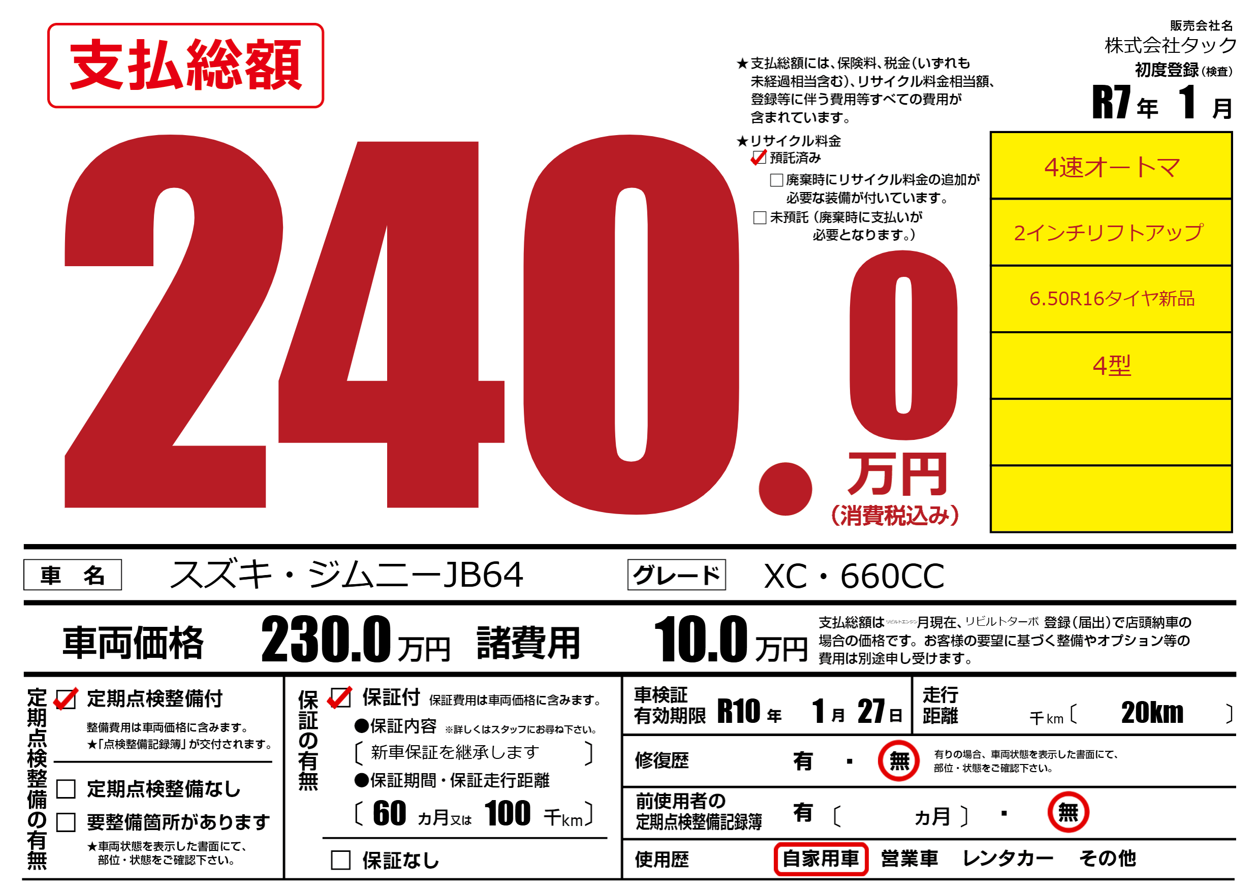 車検制限 R10年 1月 27日