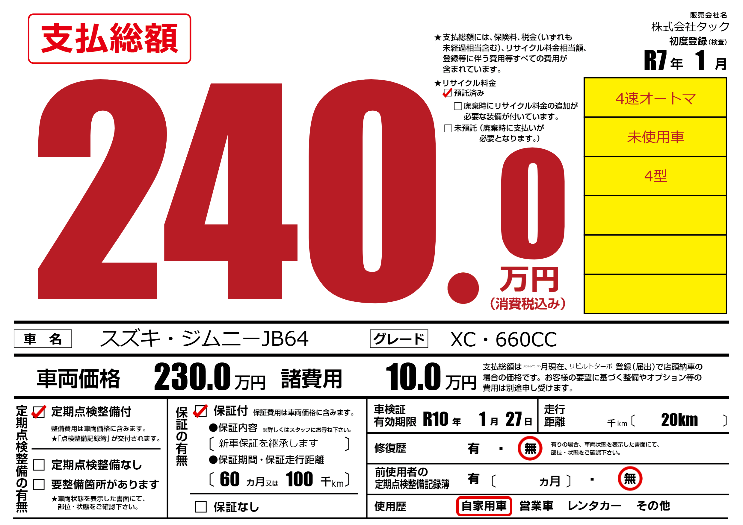 | 車名 | スズキ・ジムニーJB64 | グレード ミッション 排気量 |