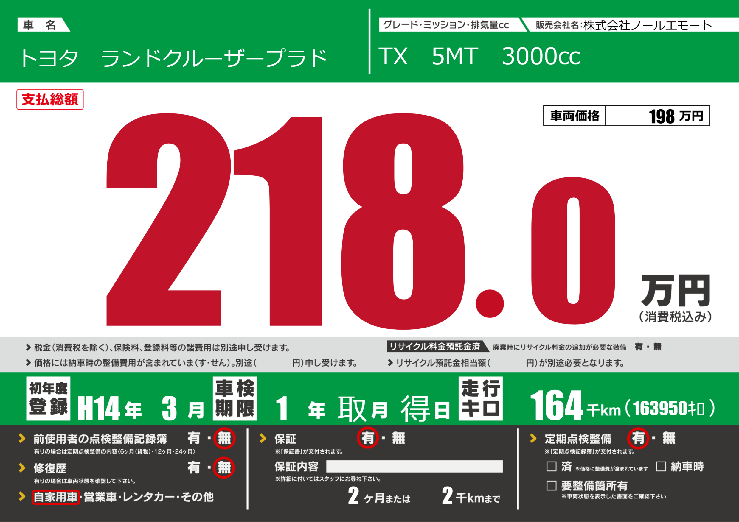 | 車名 | トヨタ ランドクルーザープラド | グレード ミッション 排気量 |