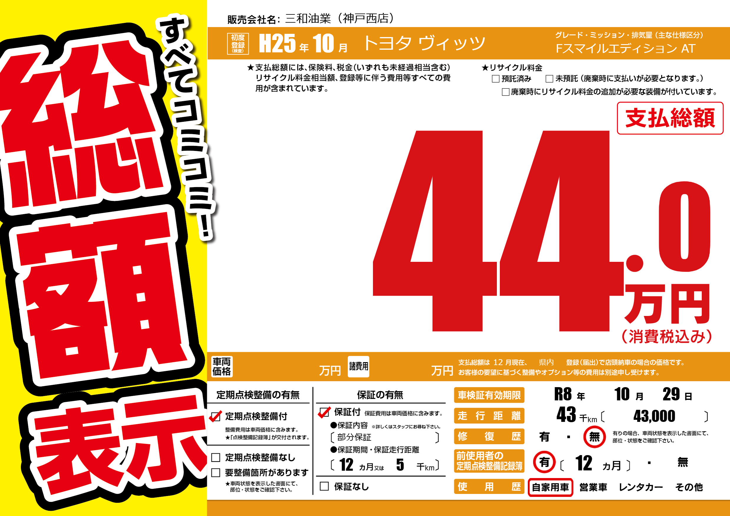 | 走行キロ | 4.3万km | 初年度登録 | H25年10月 |