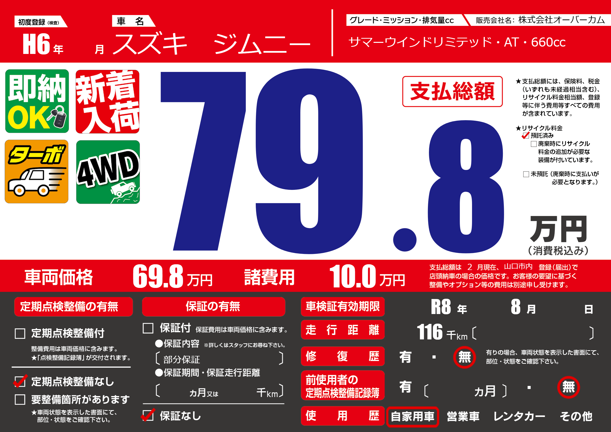 保証なし 保証内容(部分保証) ---ヶ月または()千kmまで |