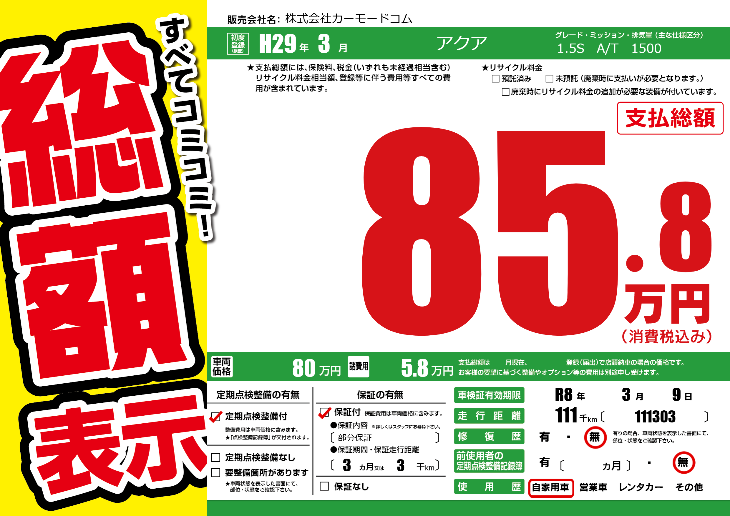 | 走行キロ | 11.1万km | 初年度登録 | H29年3月 |