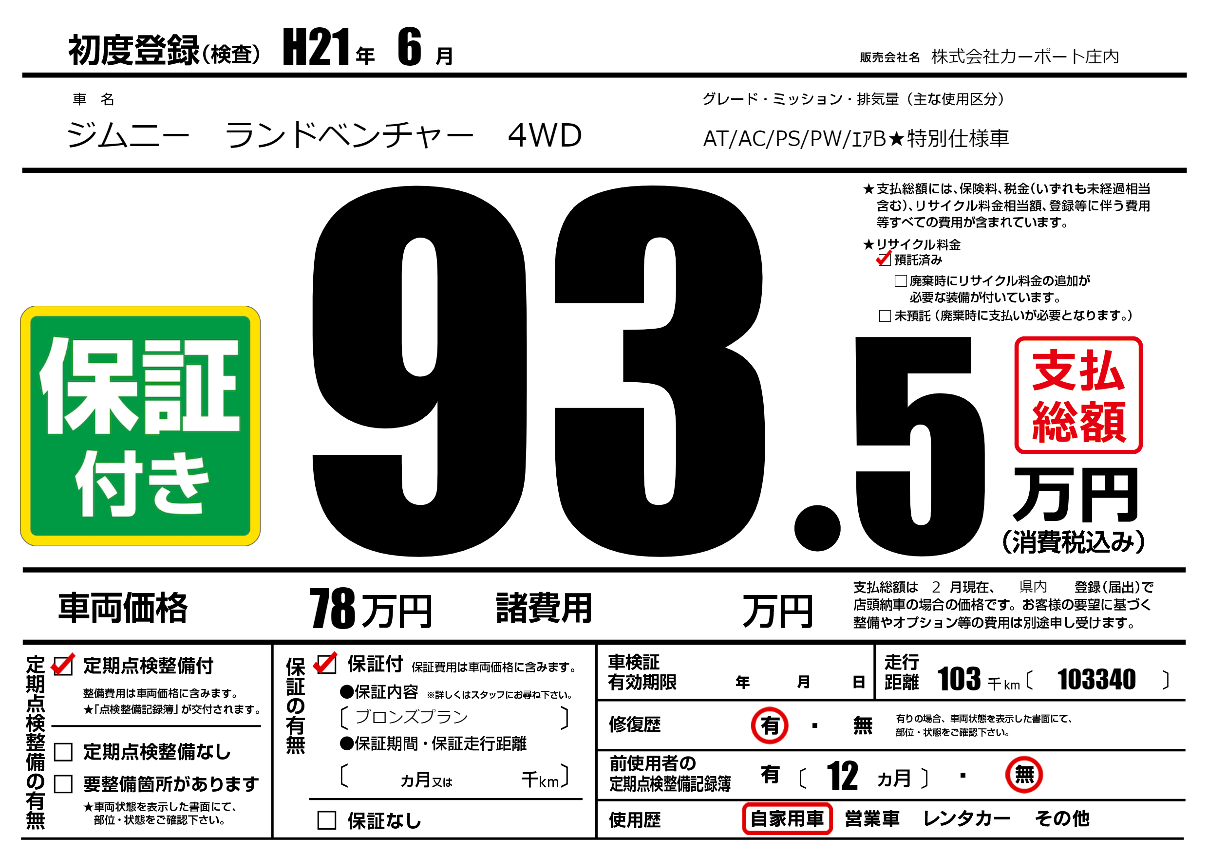 | 車名 | ジムニー ランドベンチャー 4WD | グレード ミッション 排気量 |