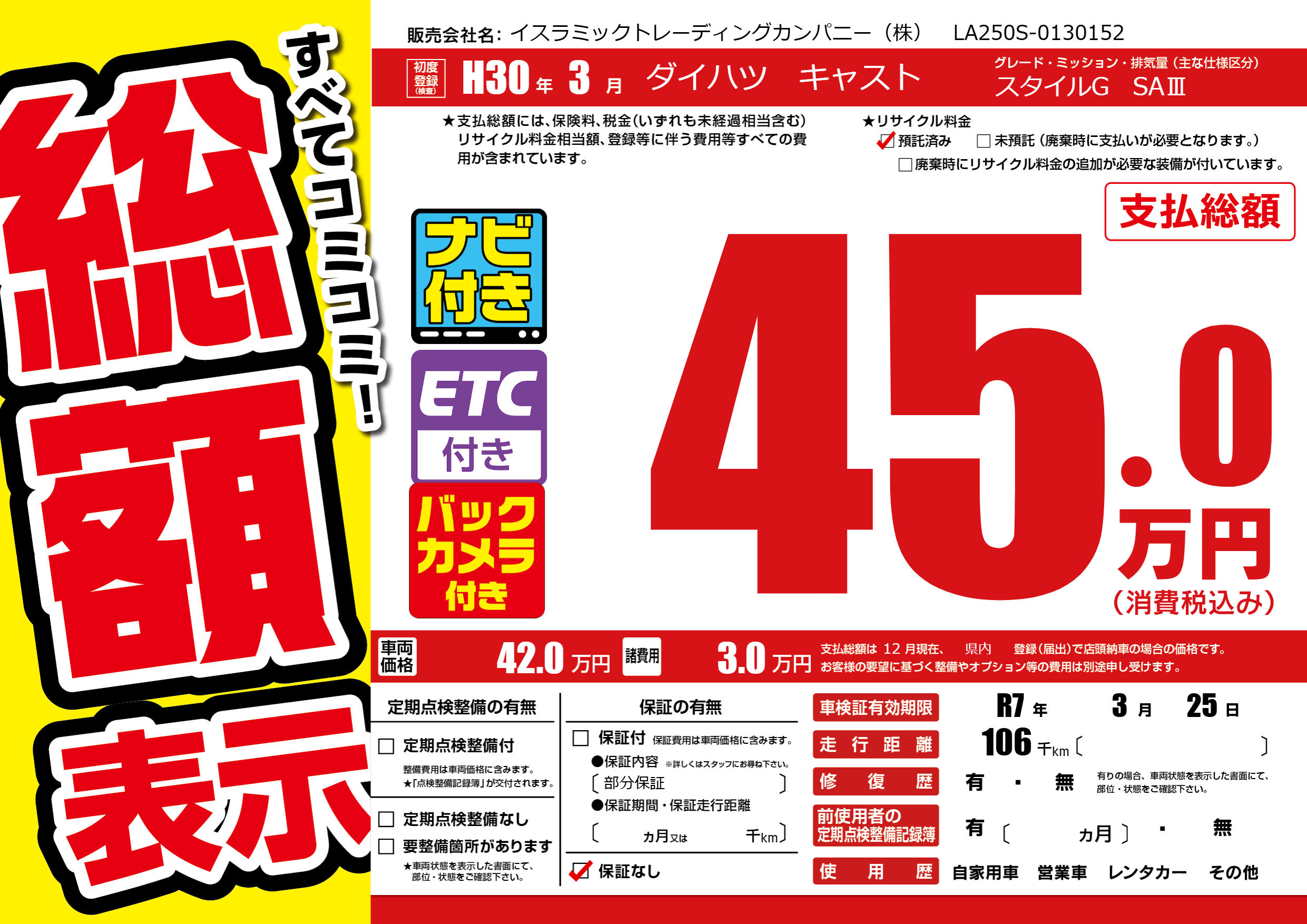 | 車検制限 | R7年 3月 25日 | ||