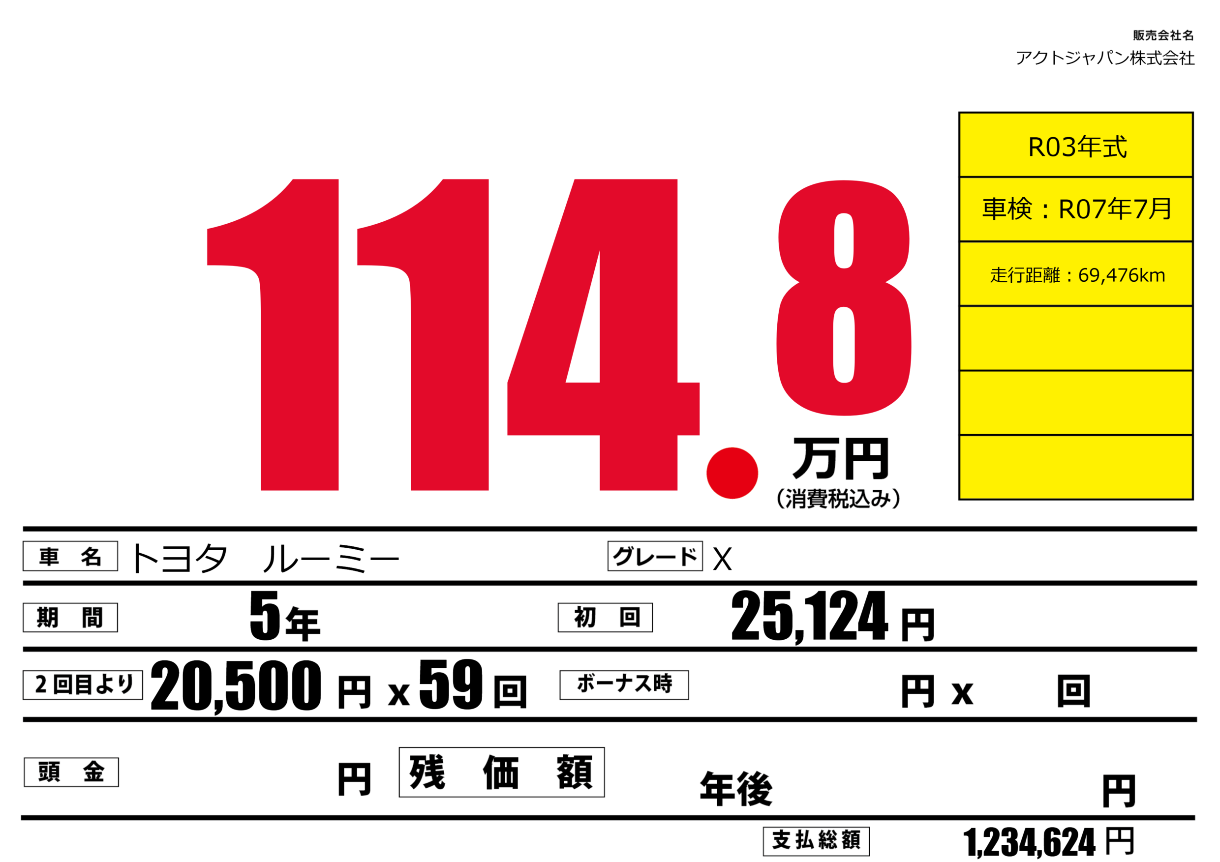 | 車名 | トヨタ ルーミー | グレード ミッション 排気量 |