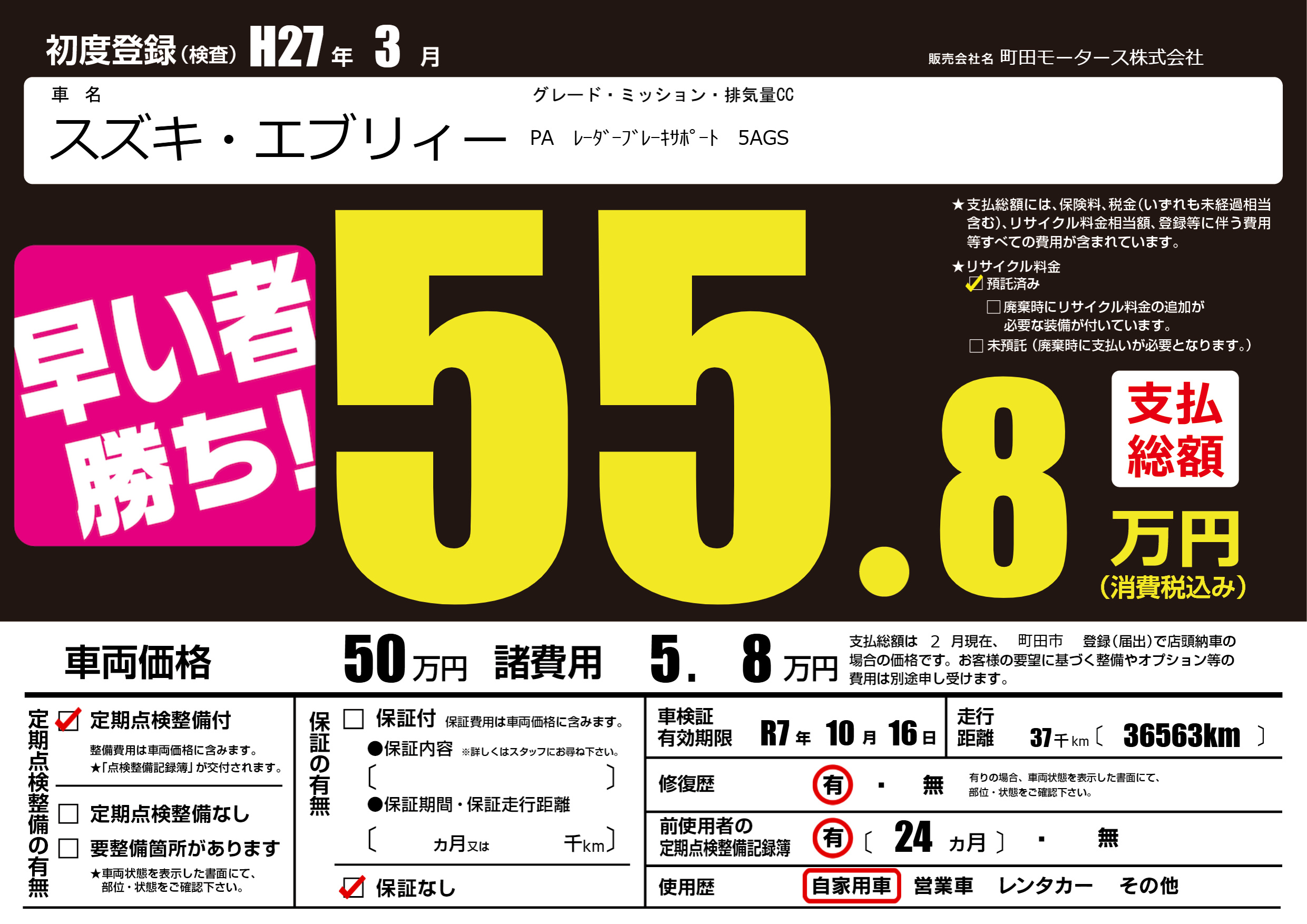 | 車名 | スズキ・エブリィー | グレード ミッション 排気量 |