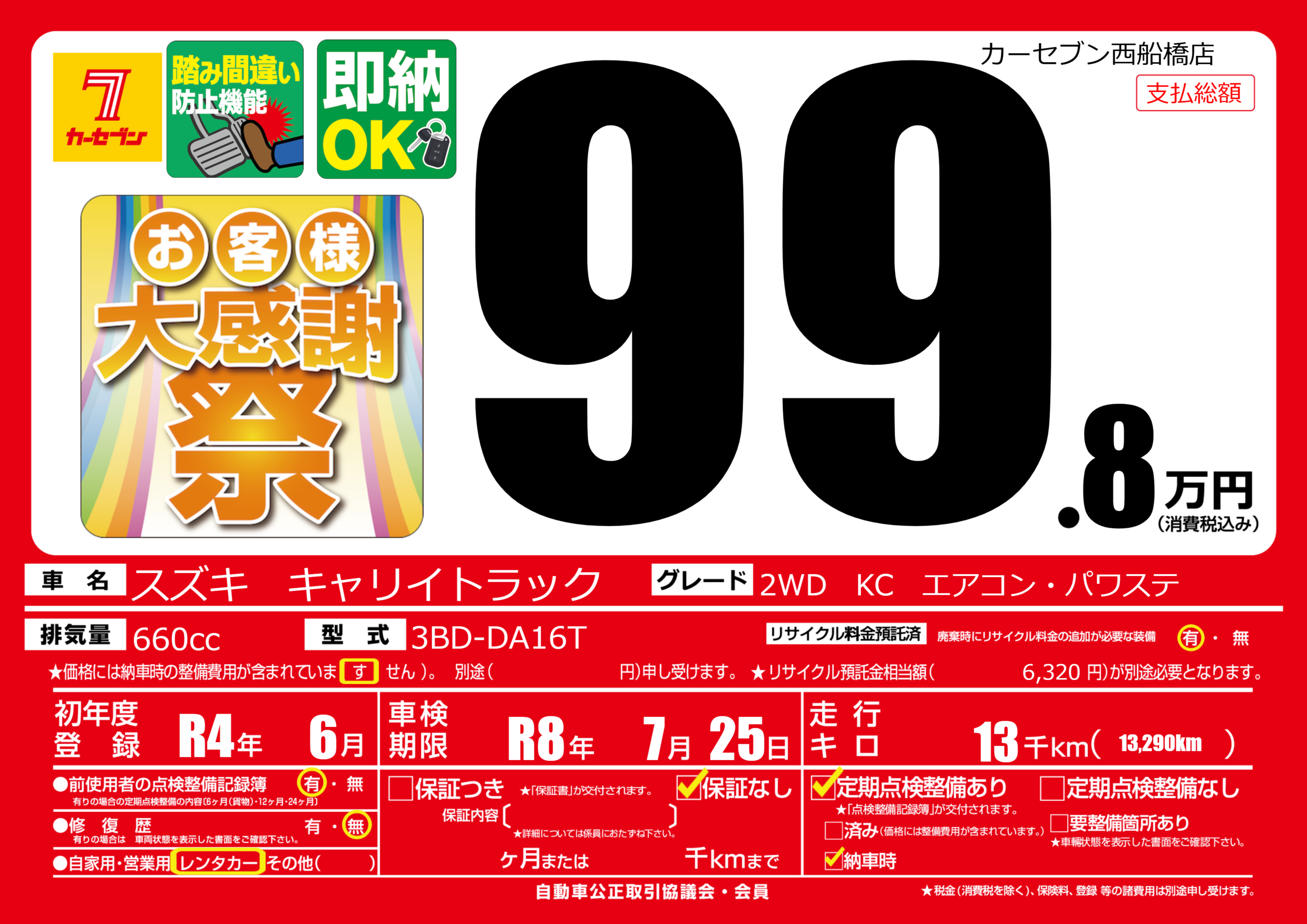 | 定期点検整備 | 定期点検整備あり 納車時あり | ||