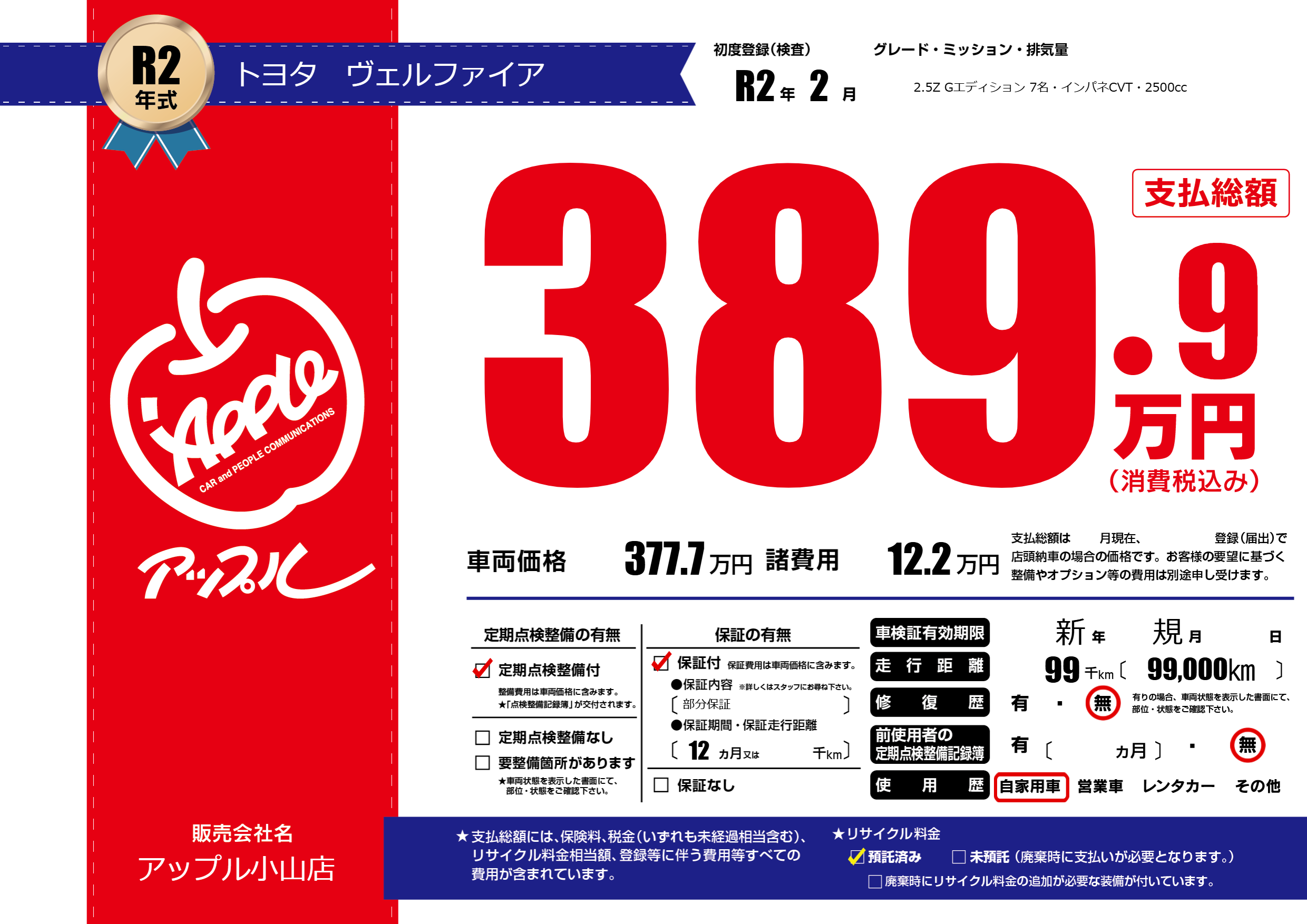 保証付き 保証内容(部分保証) 12ヶ月または()千kmまで |