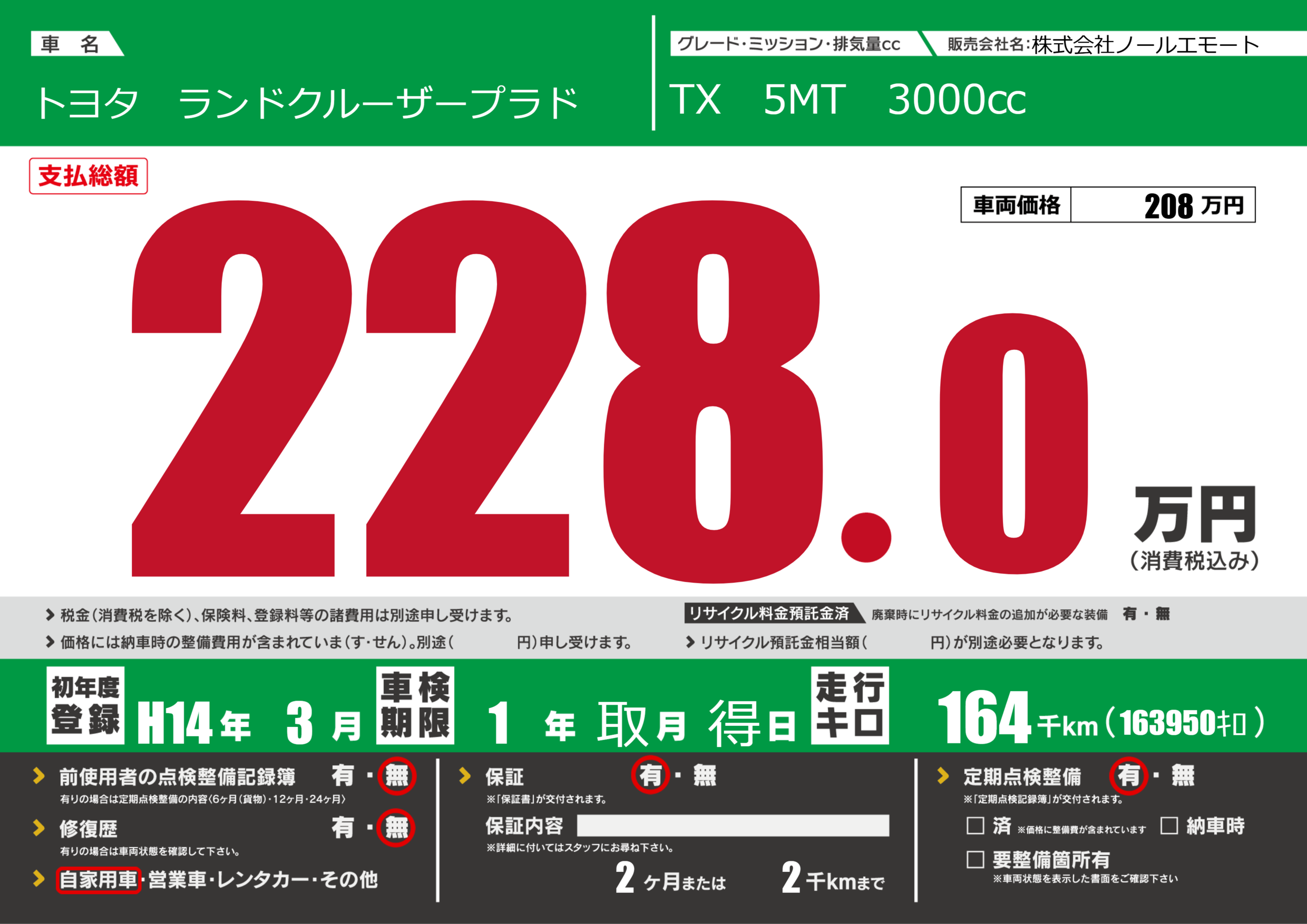| 車名 | トヨタ ランドクルーザープラド | グレード ミッション 排気量 |