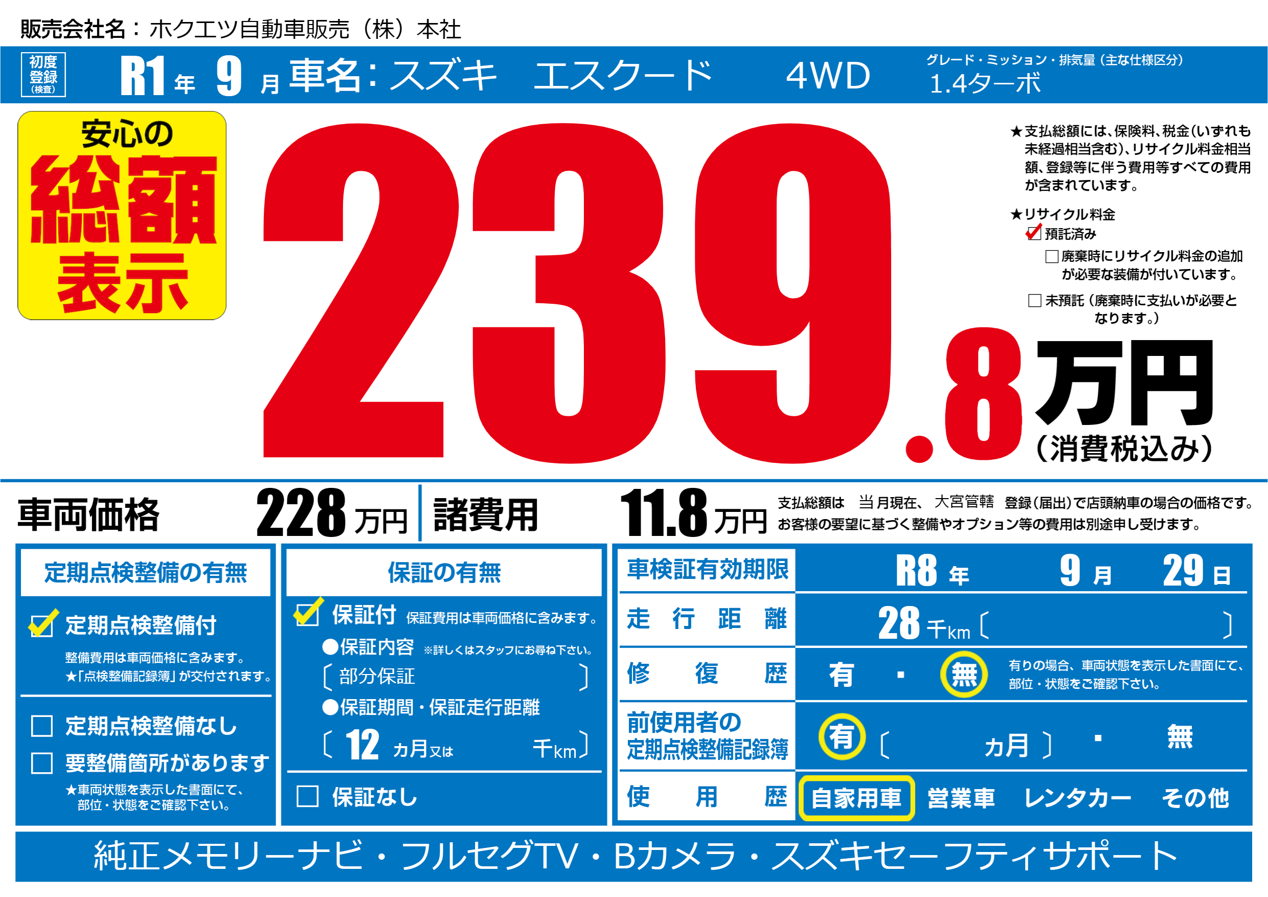 | 走行キロ | 2.8万km | 初年度登録 | R1年9月 |