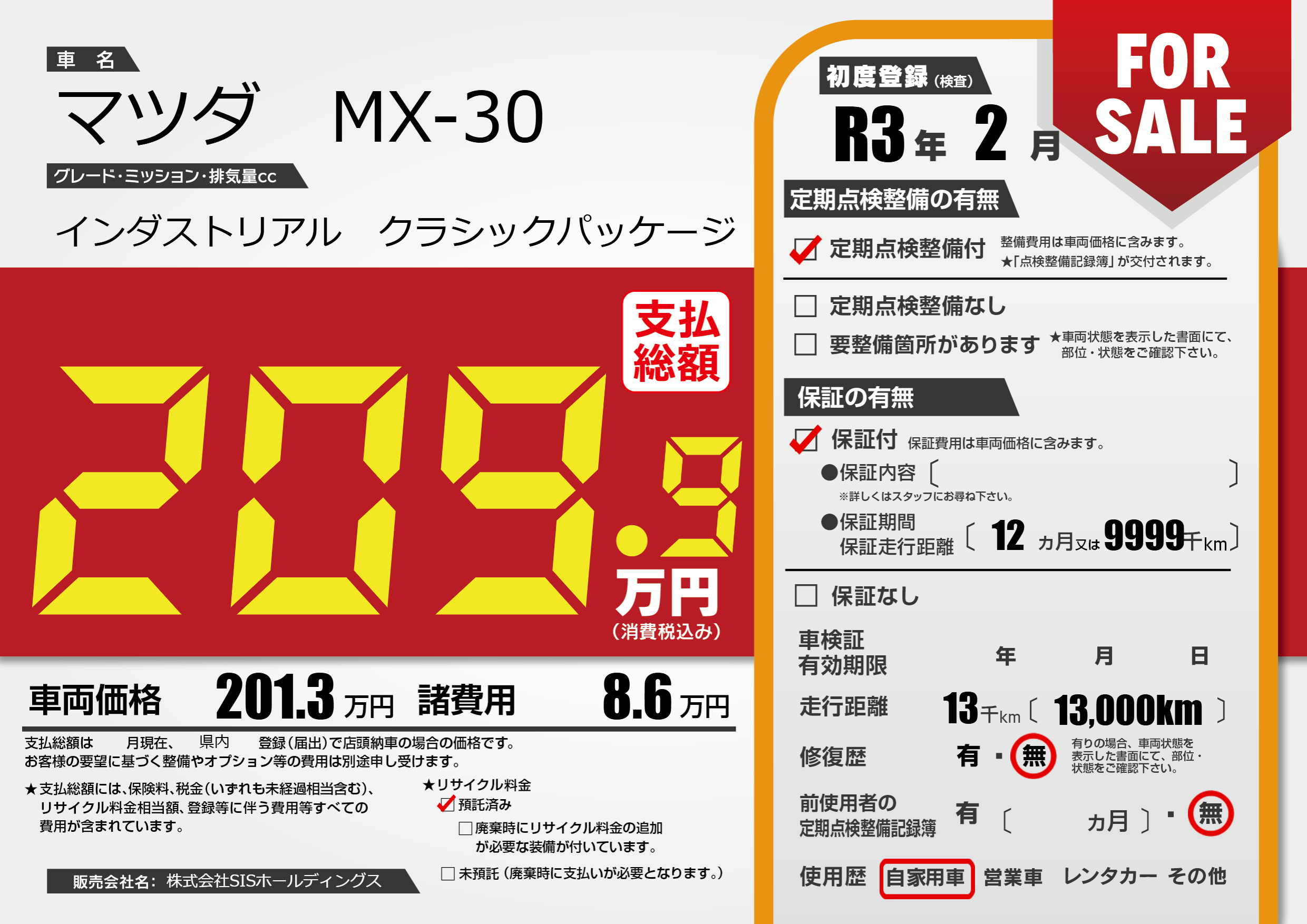 保証付き 保証内容(---) 12ヶ月または(9999)千kmまで |