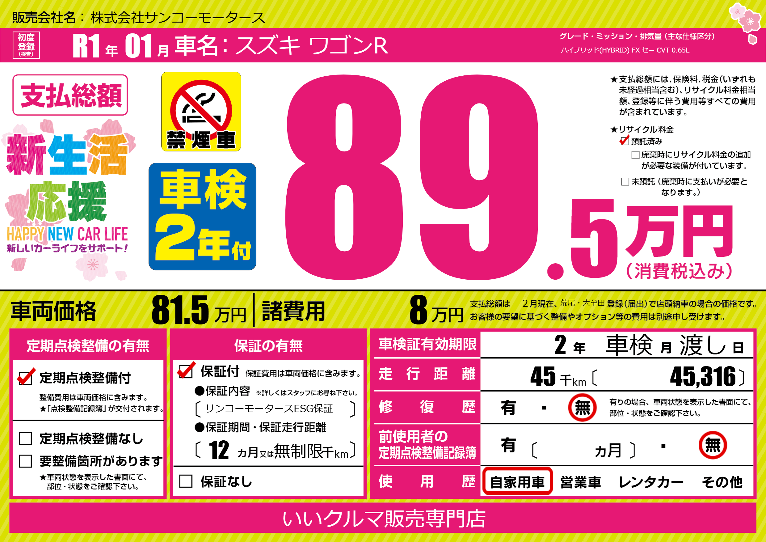 | 車名 | スズキ ワゴンR | グレード ミッション 排気量 |