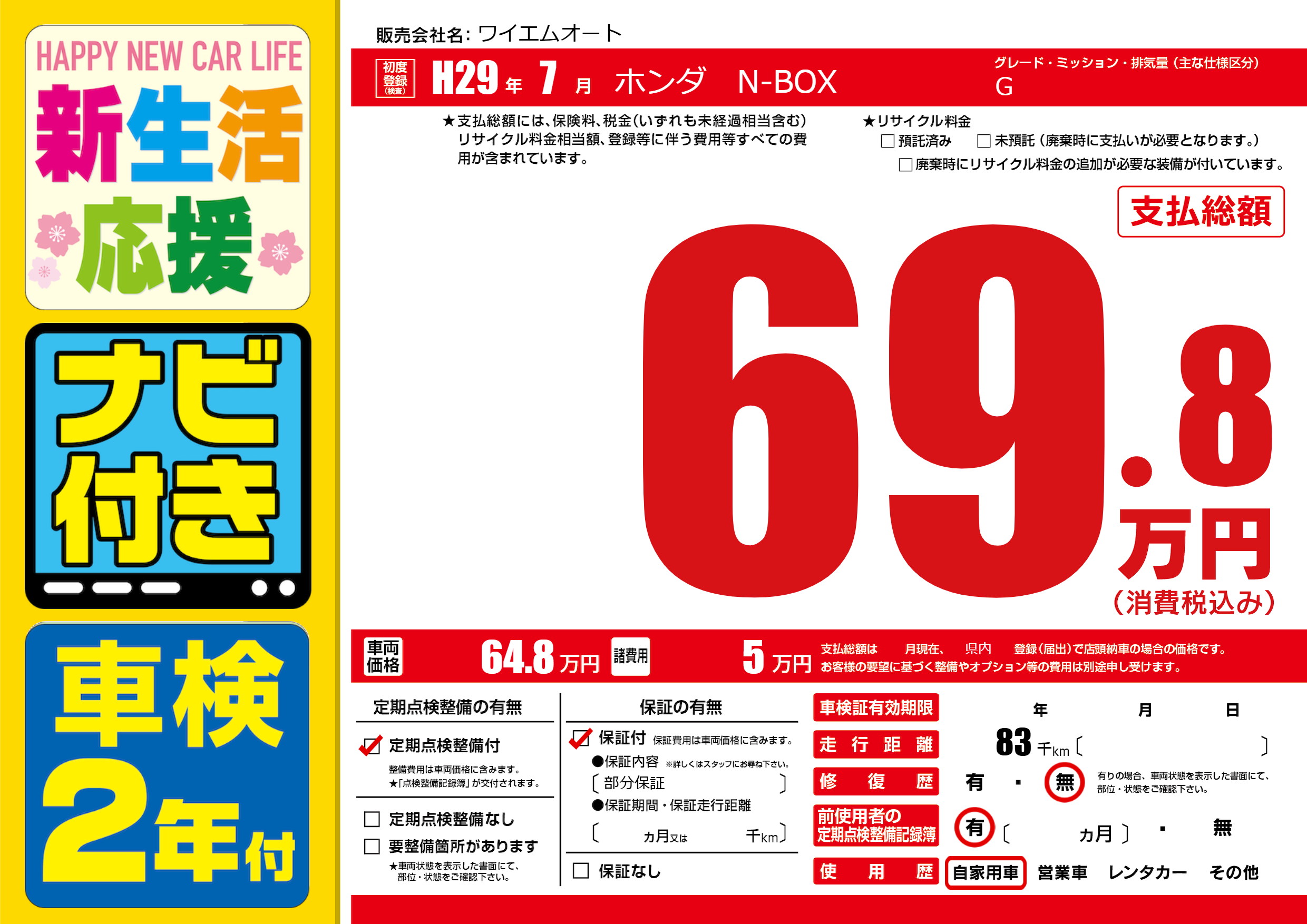 | 車名 | ホンダ N-BOX | グレード ミッション 排気量 |