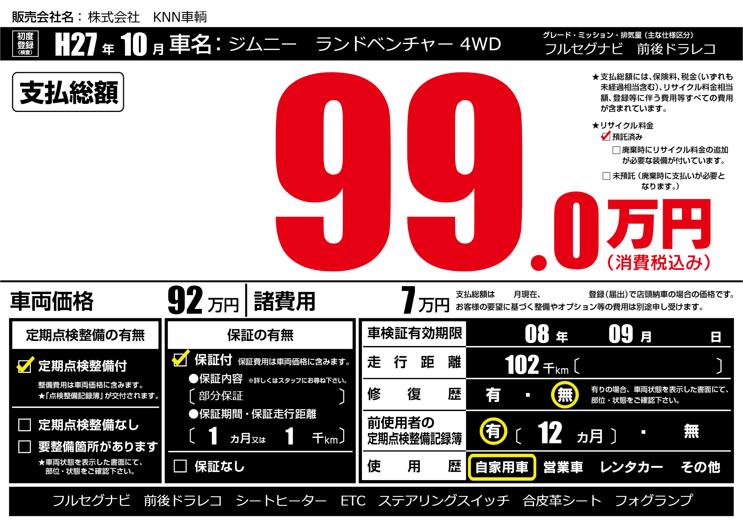 | 走行キロ | 10.2万km | 初年度登録 | H27年10月 |