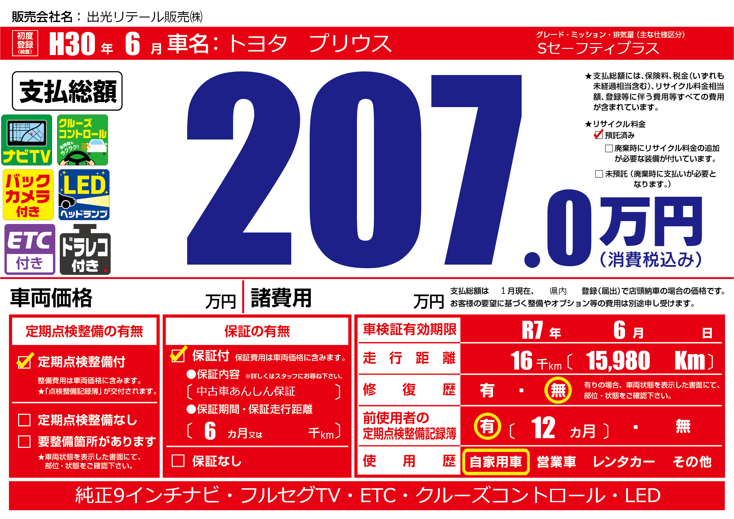 | 車名 | トヨタ プリウス | グレード ミッション 排気量 |