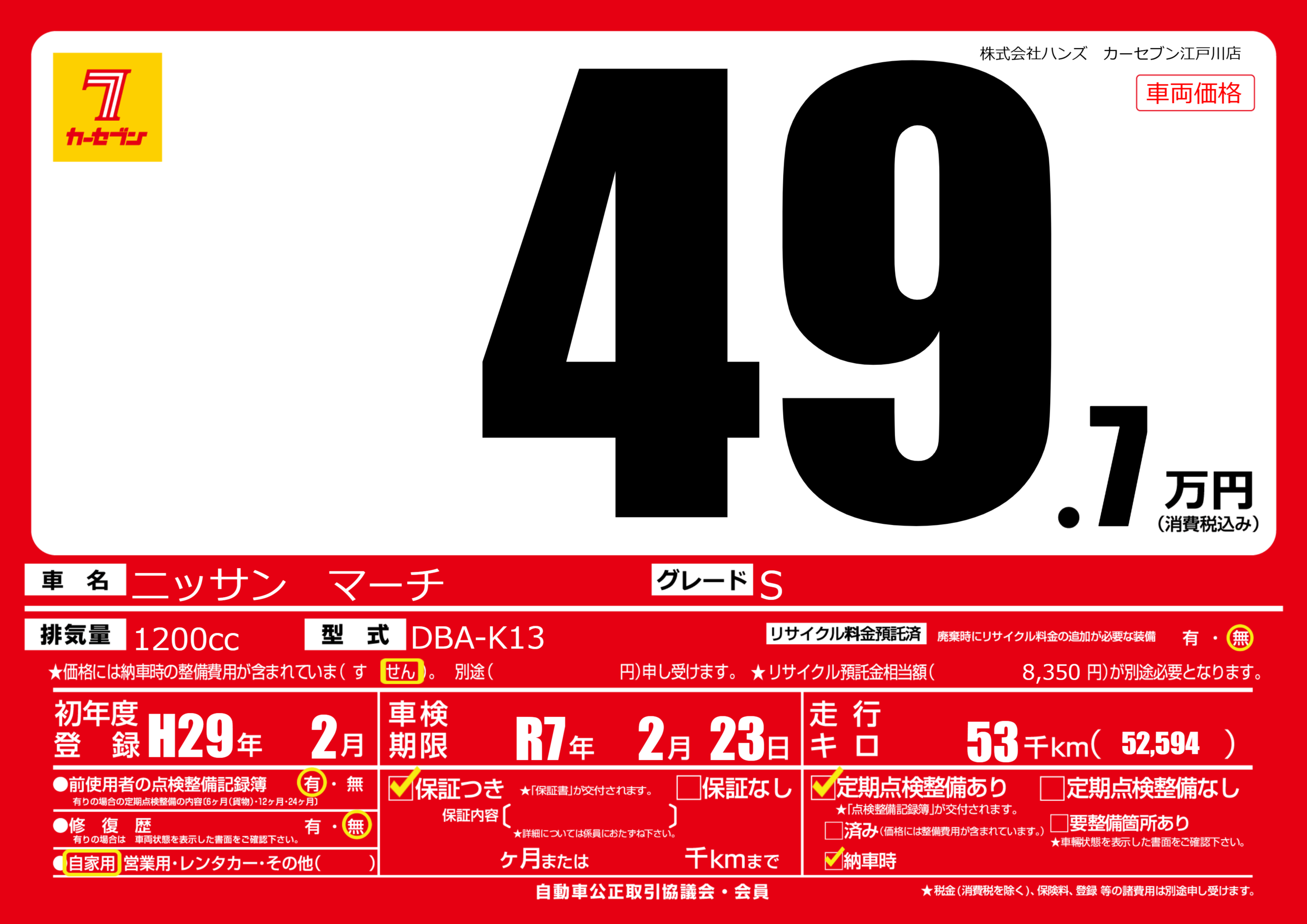 | 車名 | ニッサン マーチ | グレード ミッション 排気量 |