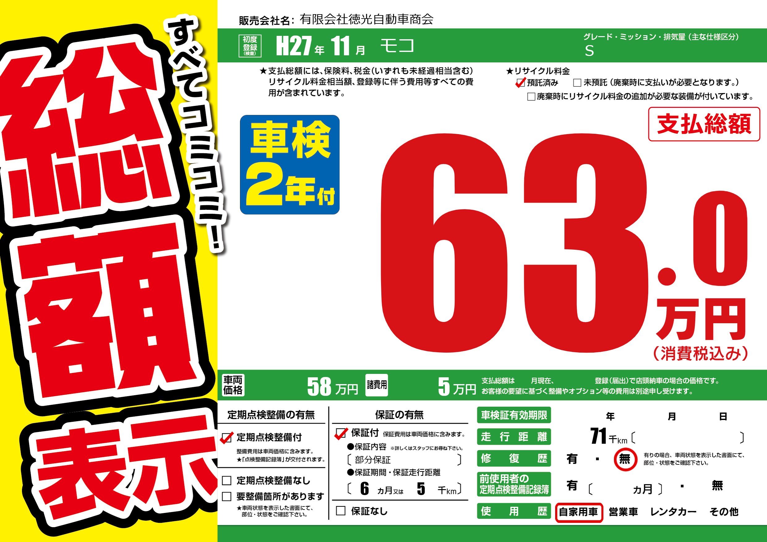 | 走行キロ | 7.1万km | 初年度登録 | H27年11月 |