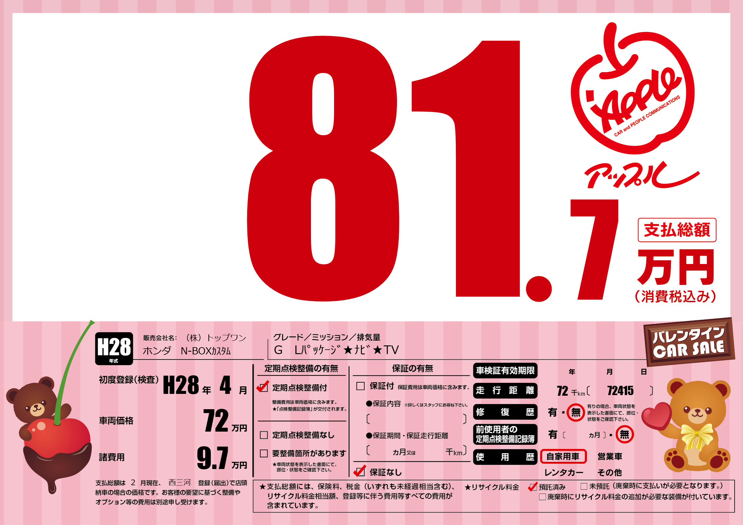 | 車名 | ホンダ N-BOXカスタム | グレード ミッション 排気量 |