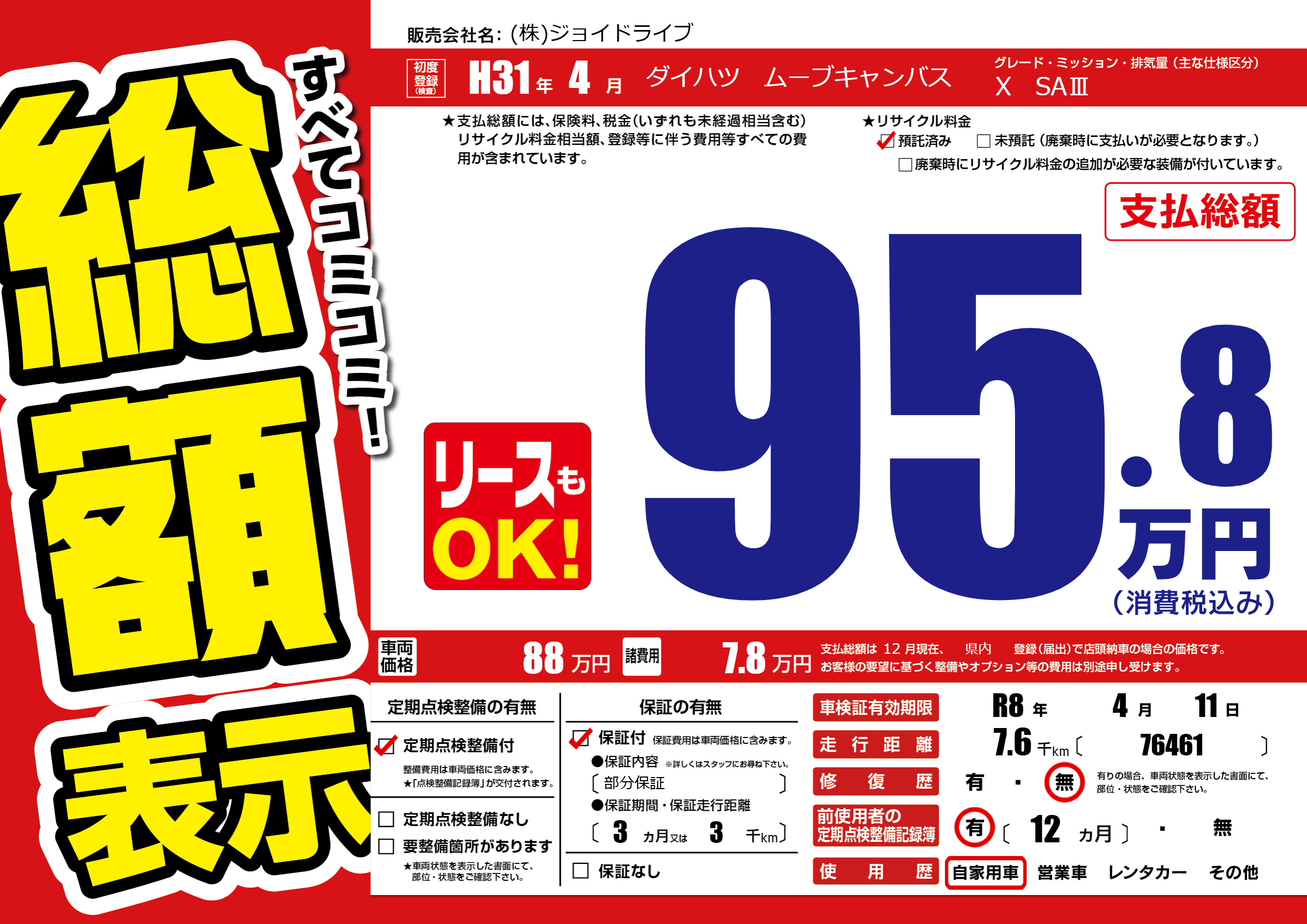 保証付き 保証内容(部分保証) 3ヶ月または(3)千kmまで |