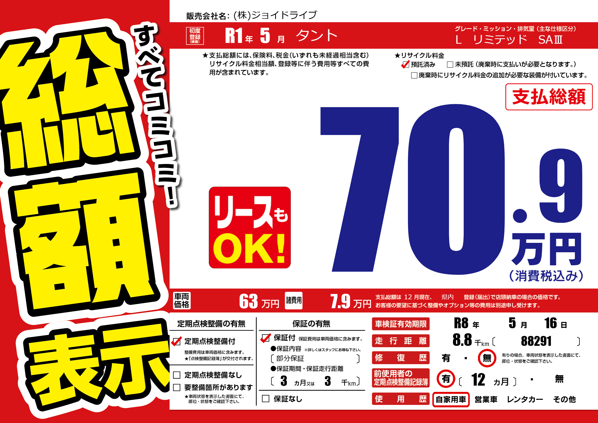 保証付き 保証内容(部分保証) 3ヶ月または(3)千kmまで |