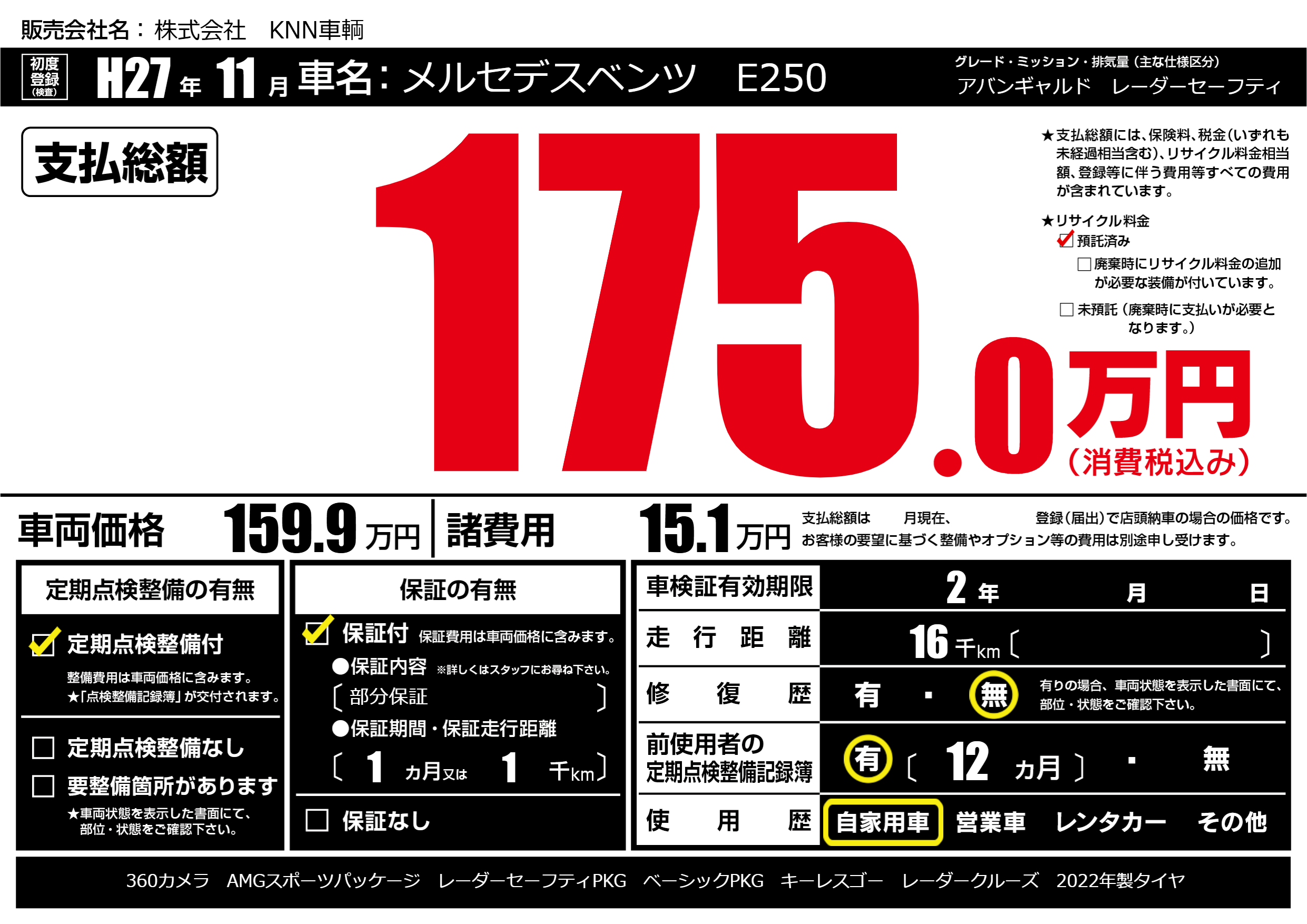 | 車名 | メルセデスベンツ E250 | グレード ミッション 排気量 |