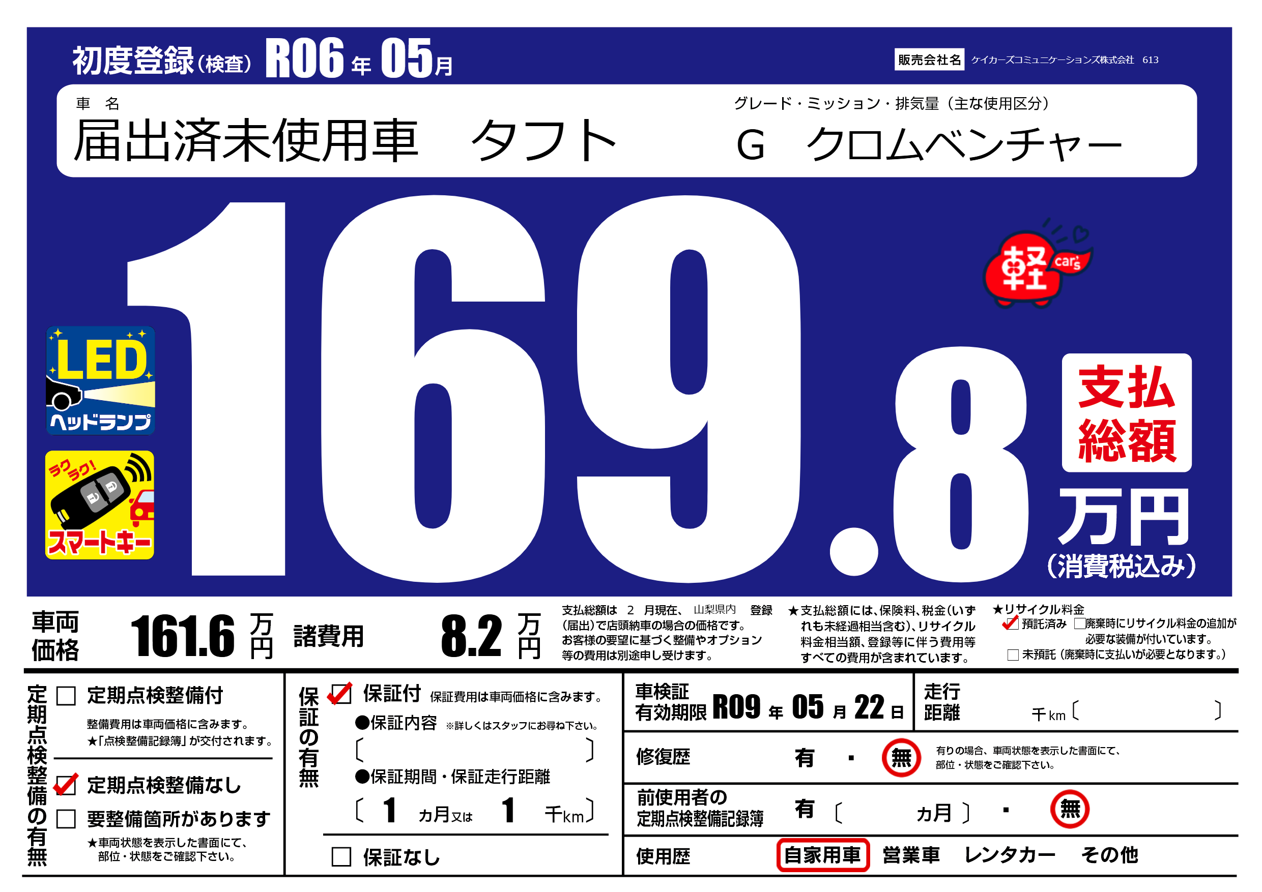 | 車名 | 届出済未使用車 タフト | グレード ミッション 排気量 |