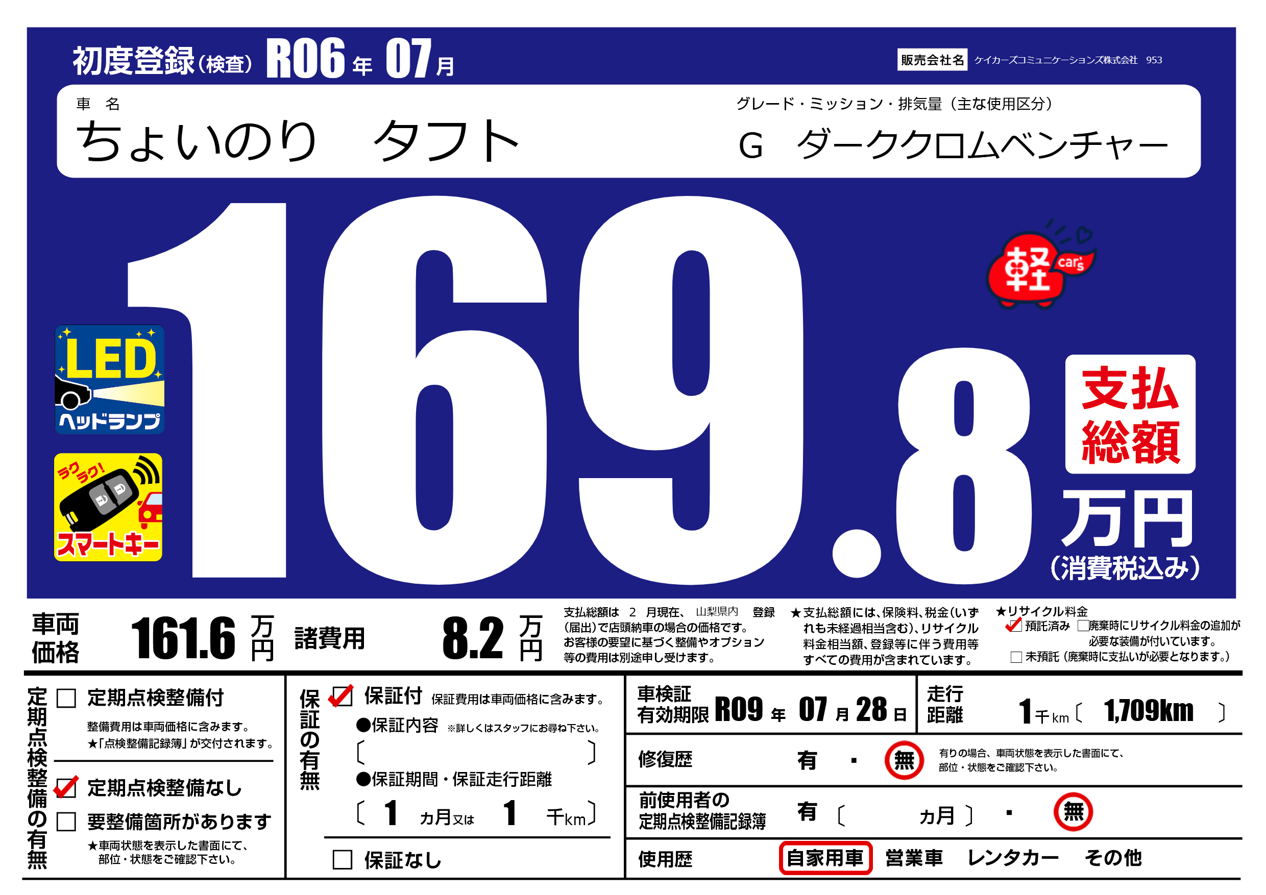 | 走行キロ | 0.1万km | 初年度登録 | R06年07月 |