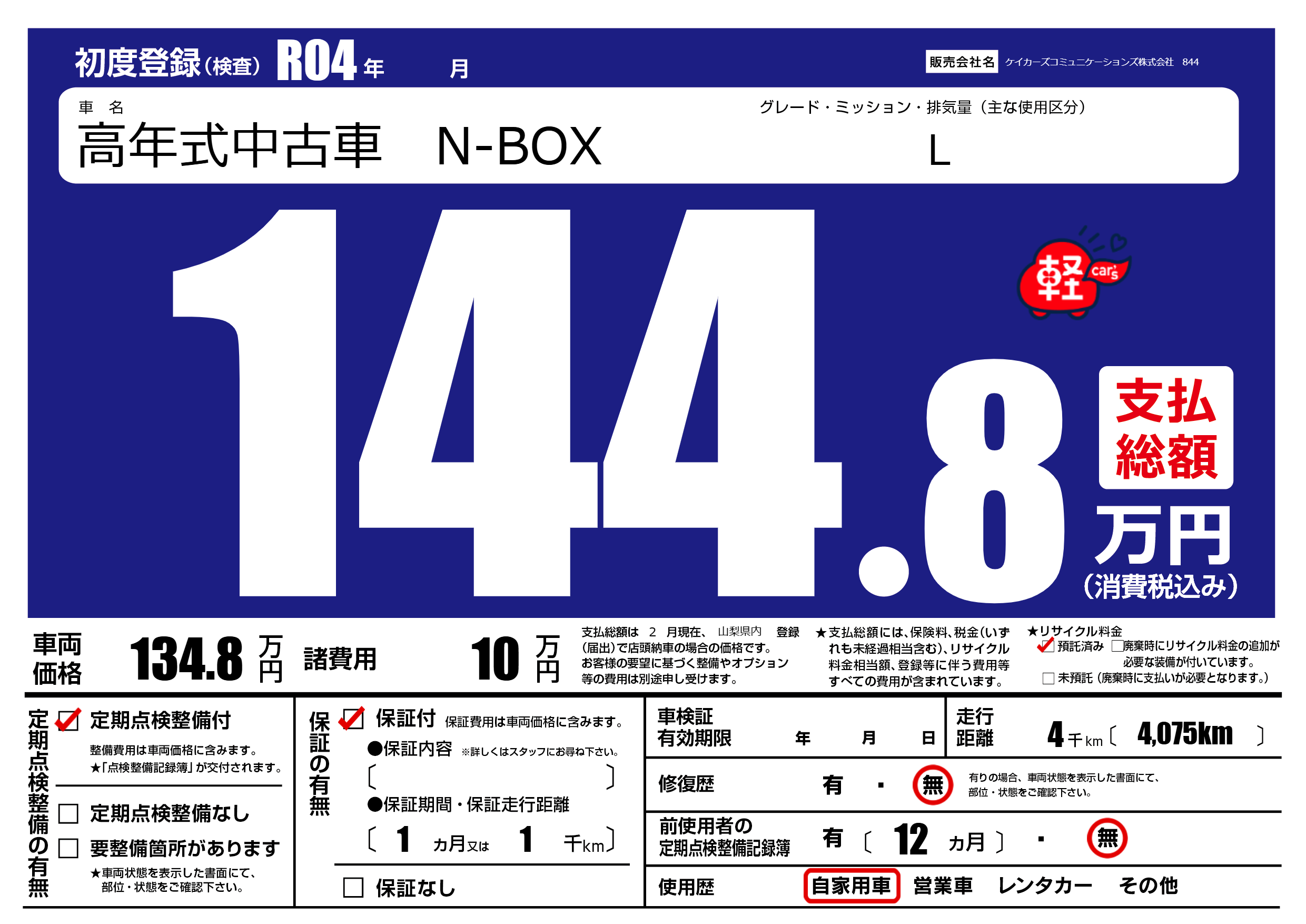 | 走行キロ | 0.4万km | 初年度登録 | R04年---月 |