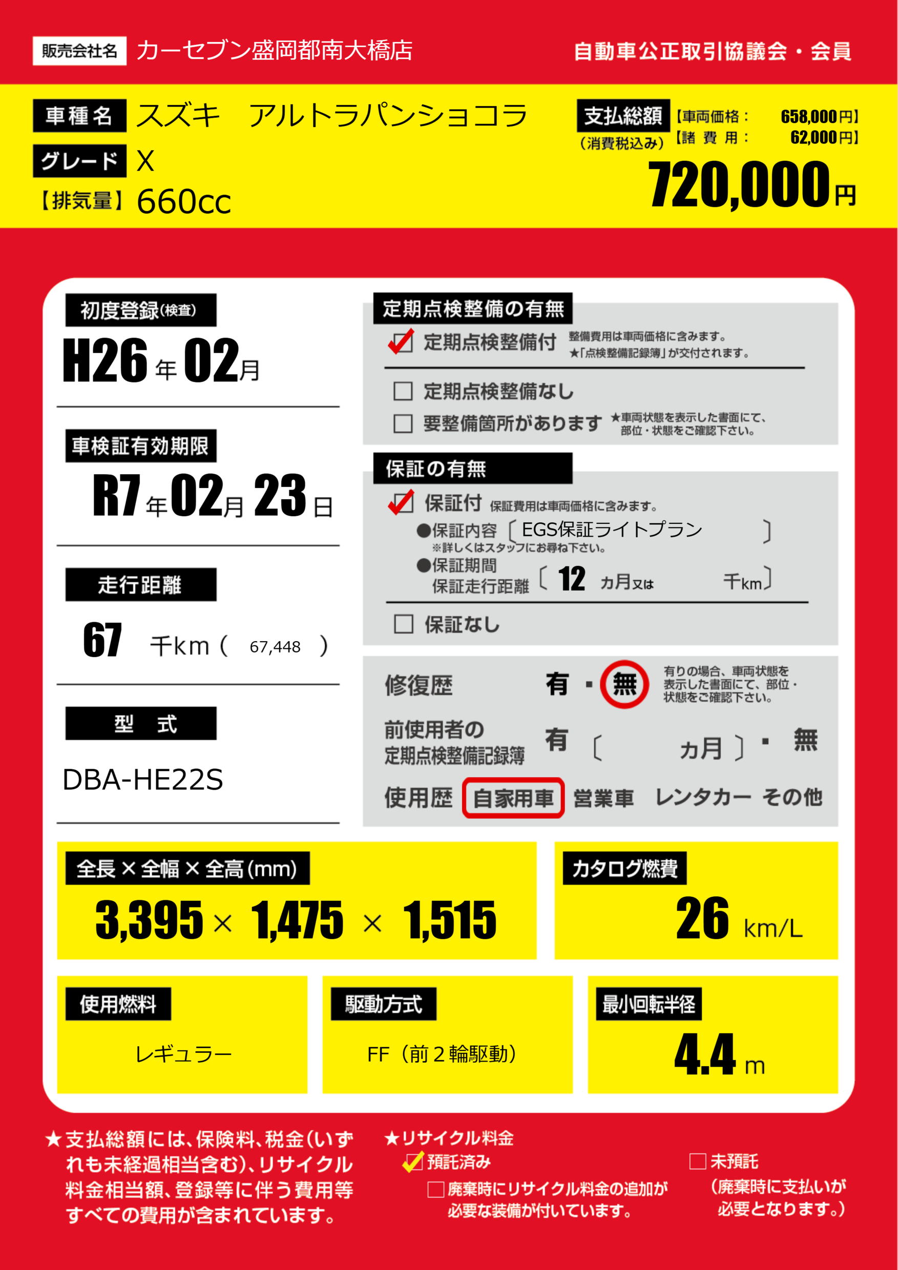 | 走行キロ | 6.7万km | 初年度登録 | H26年02月 |