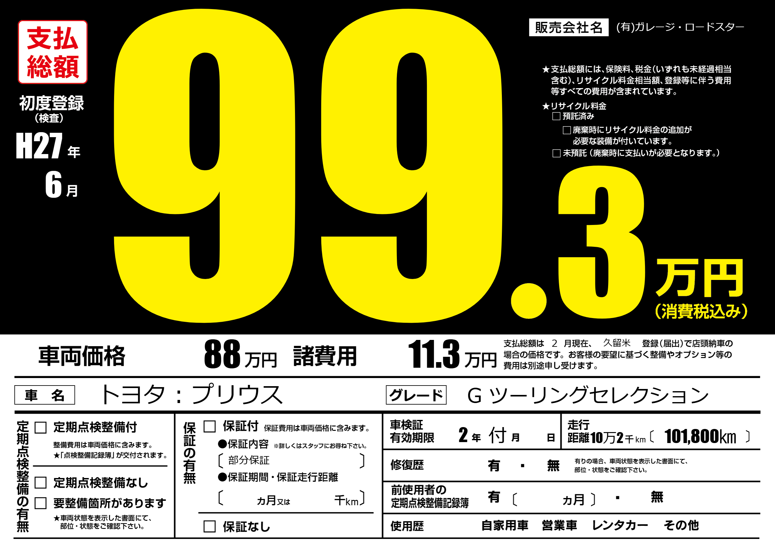 | 車名 | トヨタ : プリウス | グレード ミッション 排気量 |