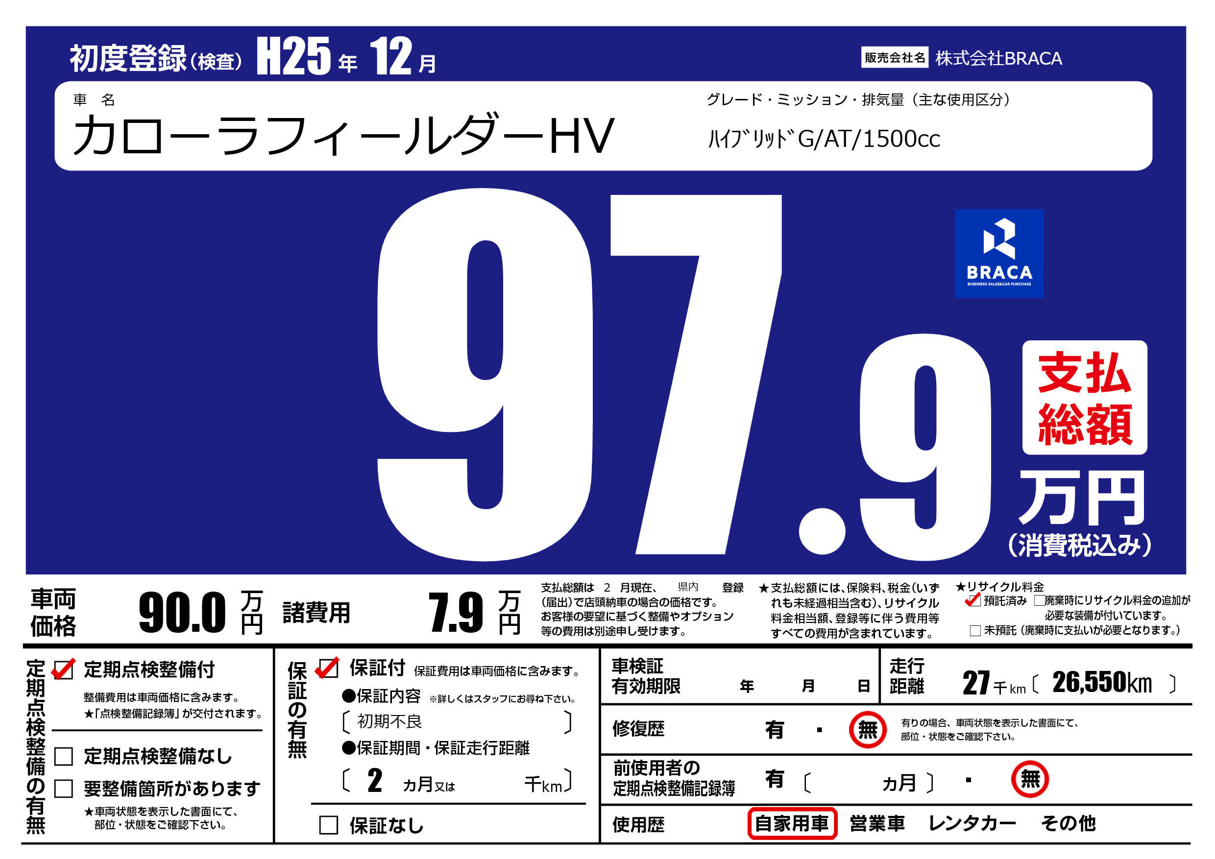 | 走行キロ | 2.7万km | 初年度登録 | H25年12月 |