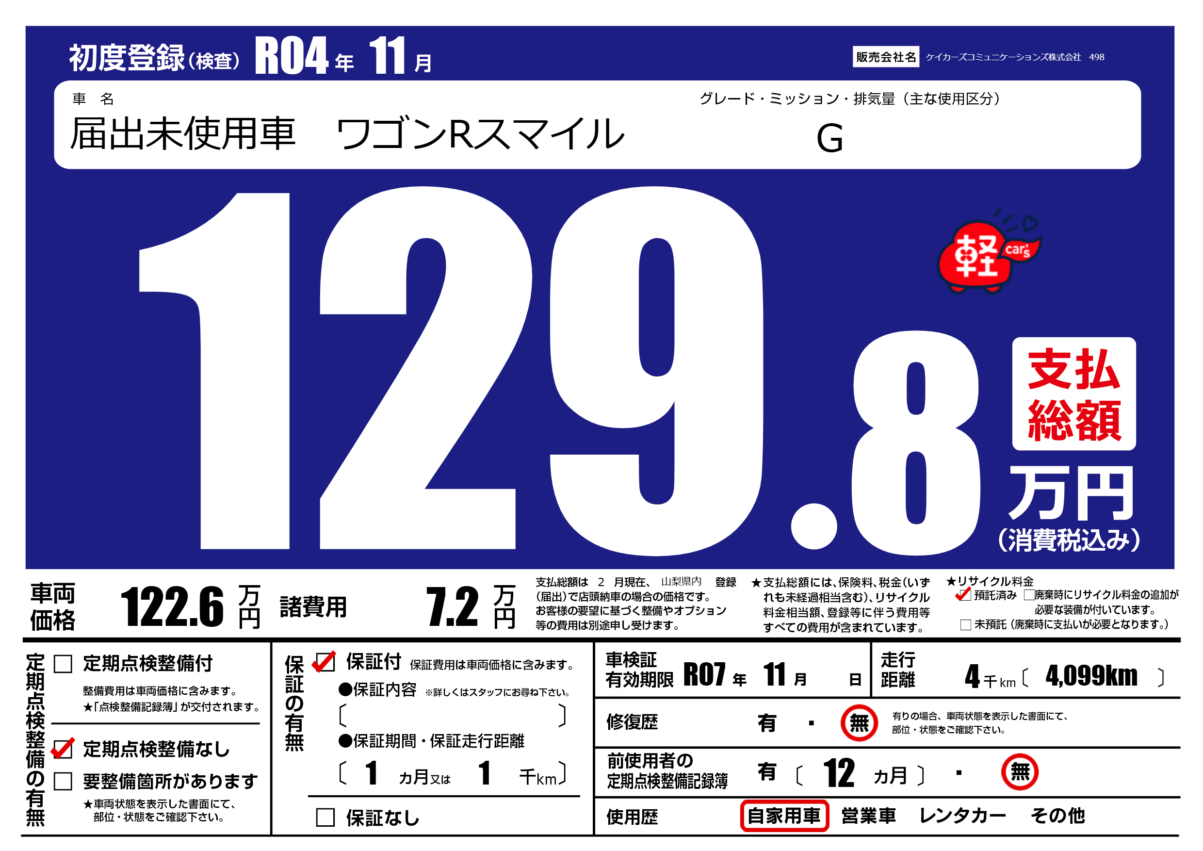 | 車名 | 届出未使用車 ワゴンRスマイル | グレード ミッション 排気量 |
