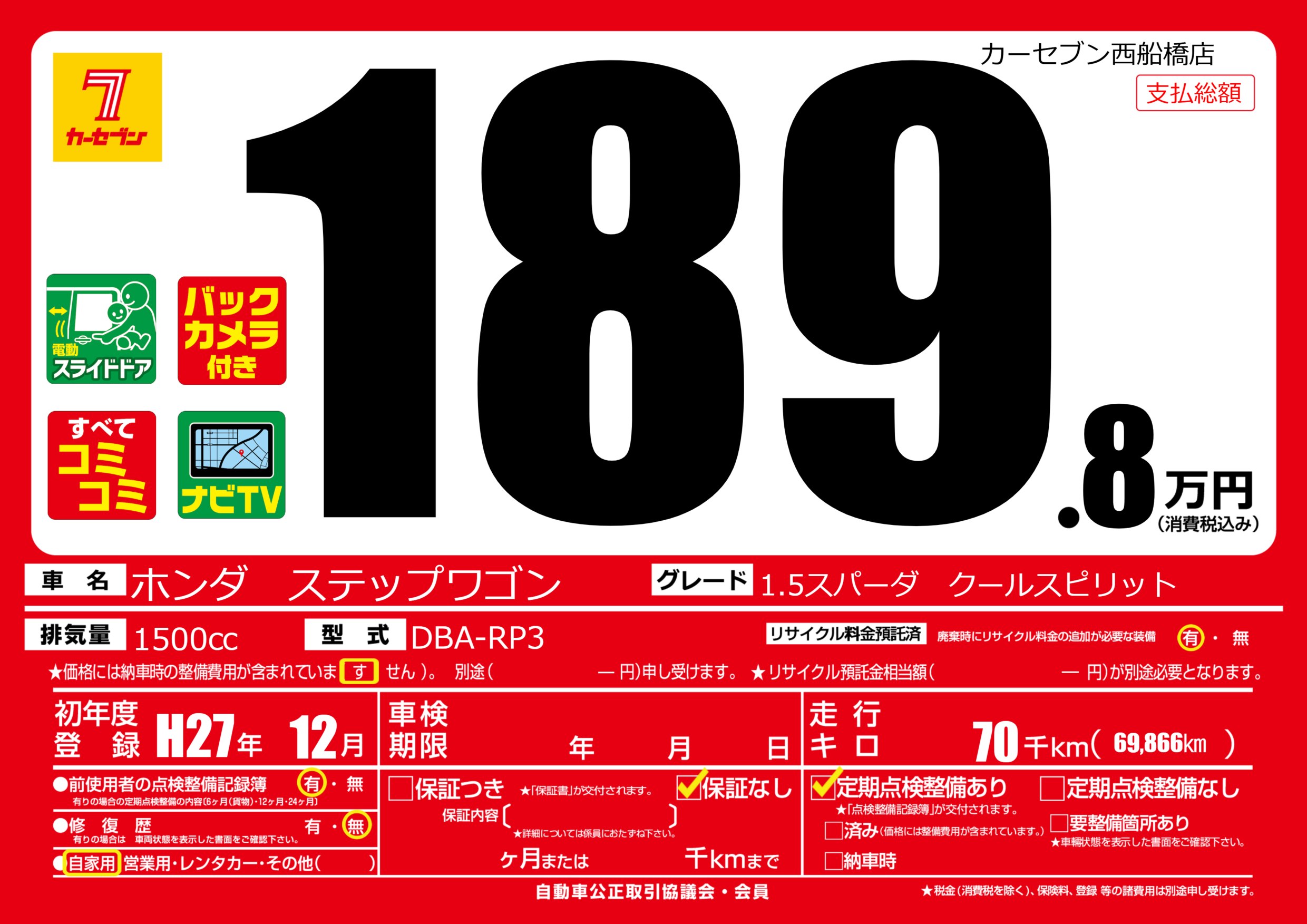 | 走行キロ | 7万km | 初年度登録 | H27年12月 |