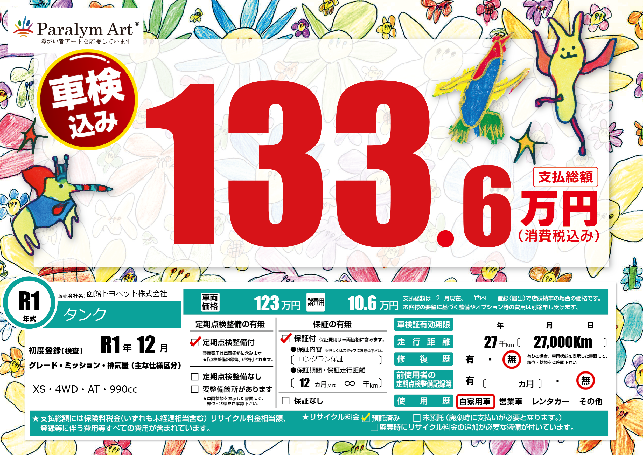 | 走行キロ | 2.7万km | 初年度登録 | R1年12月 |