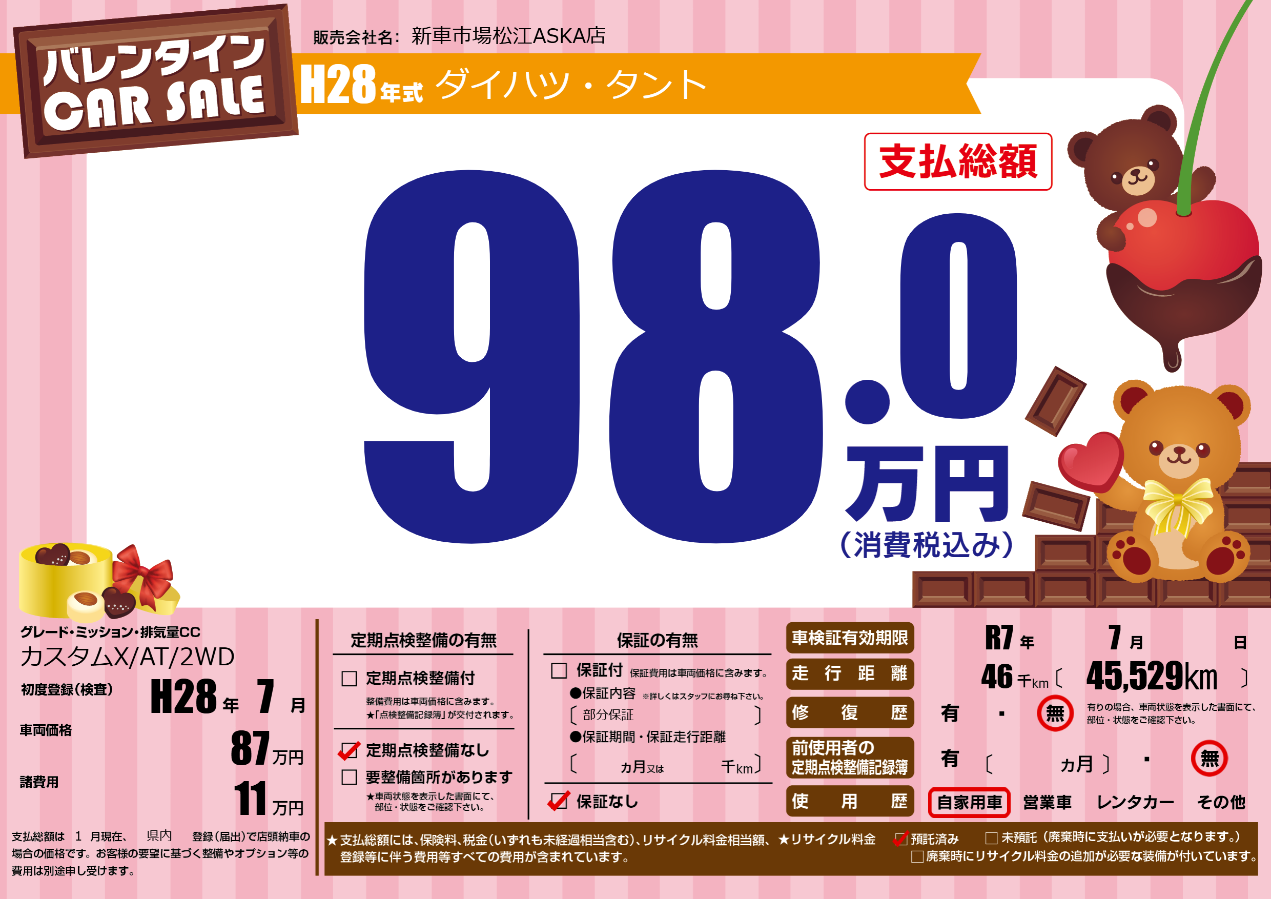 | 車名 | ダイハツ・タント | グレード ミッション 排気量 |
