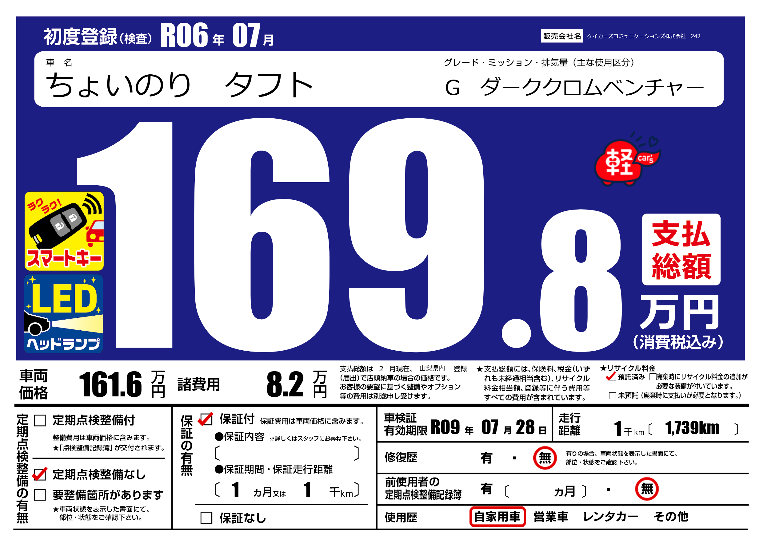 | 走行キロ | 0.1万km | 初年度登録 | R06年07月 |