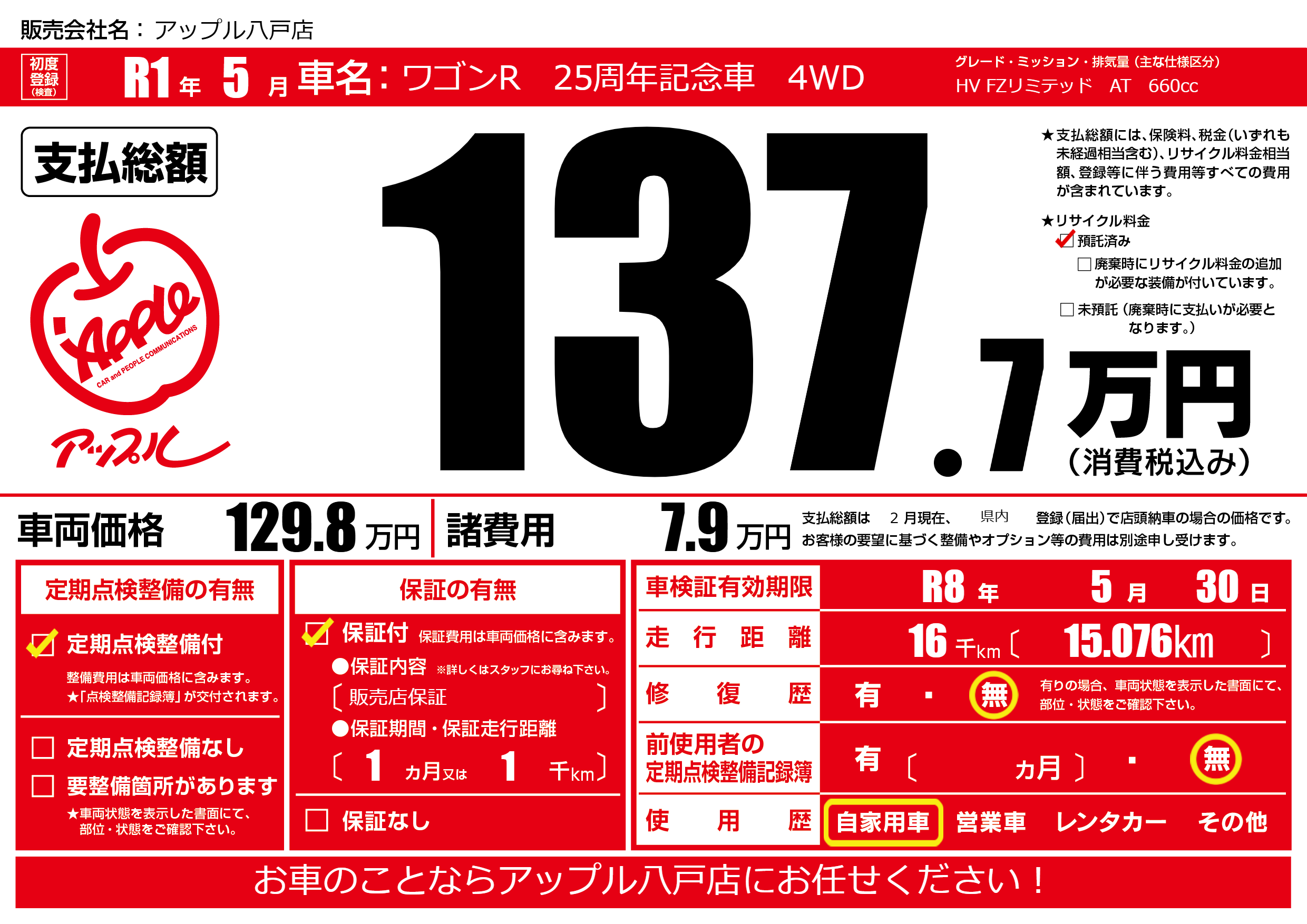 | 車名 | ワゴンR 25周年記念車 4WD | グレード ミッション 排気量 |