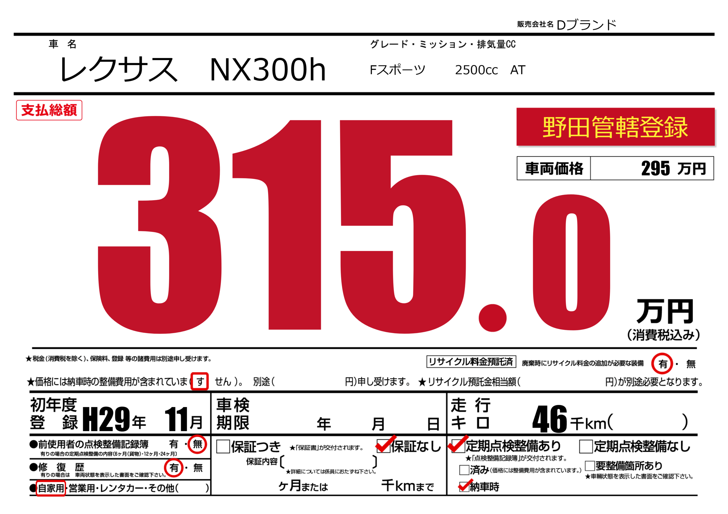 | 車名 | レクサス NX300h | グレード ミッション 排気量 |
