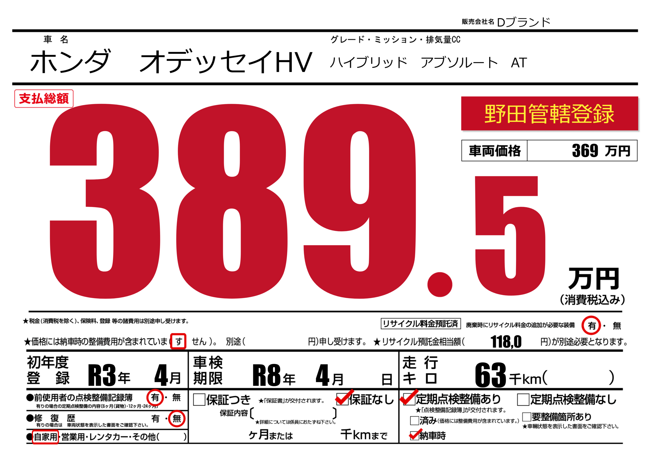 | 車名 | ホンダ オデッセイHV | グレード ミッション 排気量 |